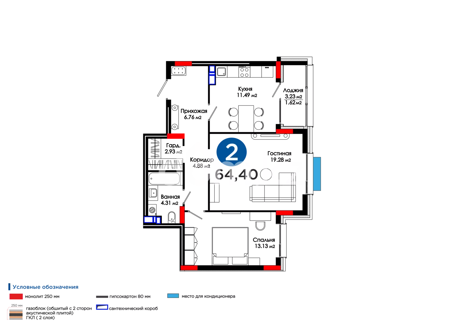 Площадь 64.4 м²