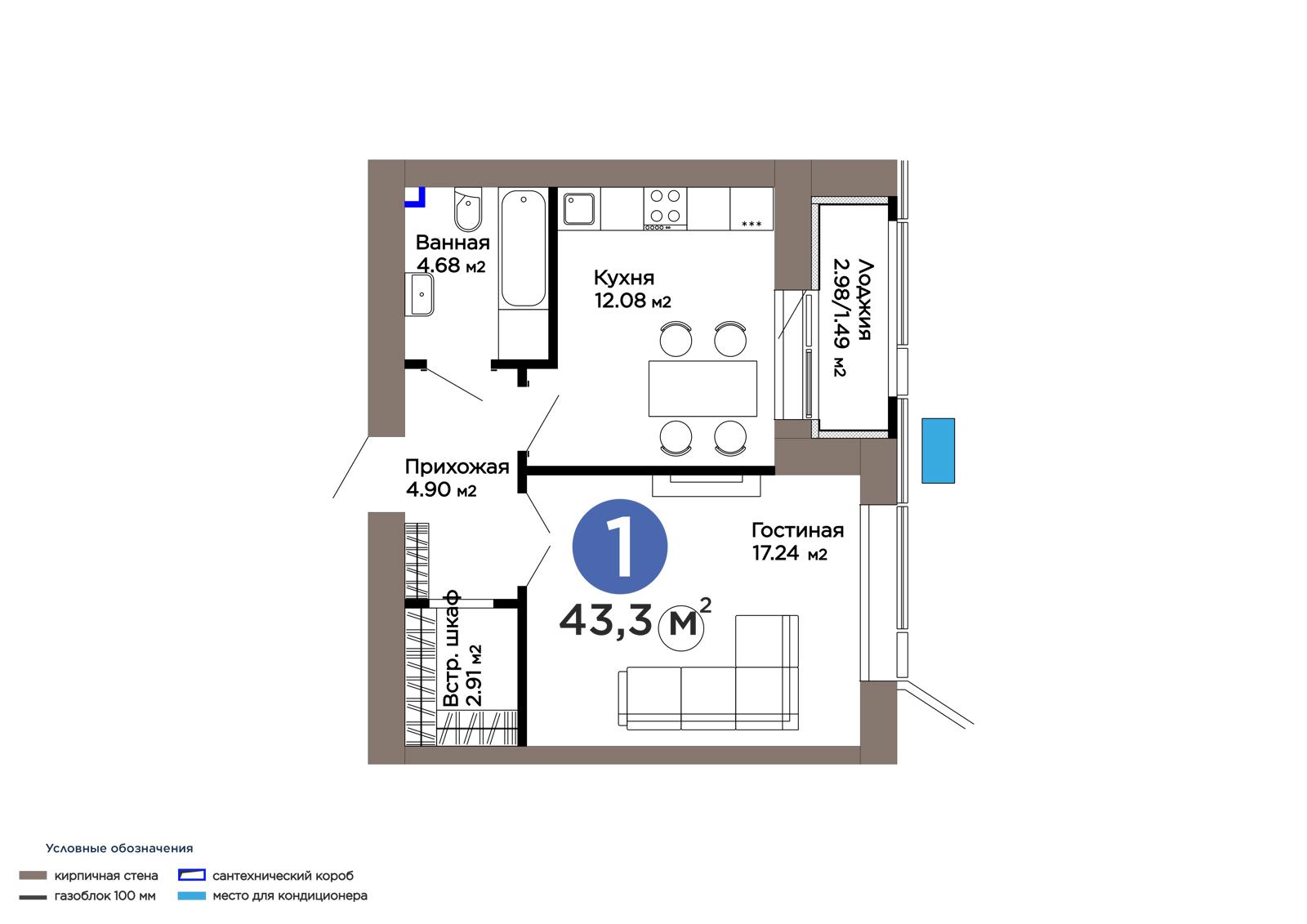 Площадь 43.3 м²
