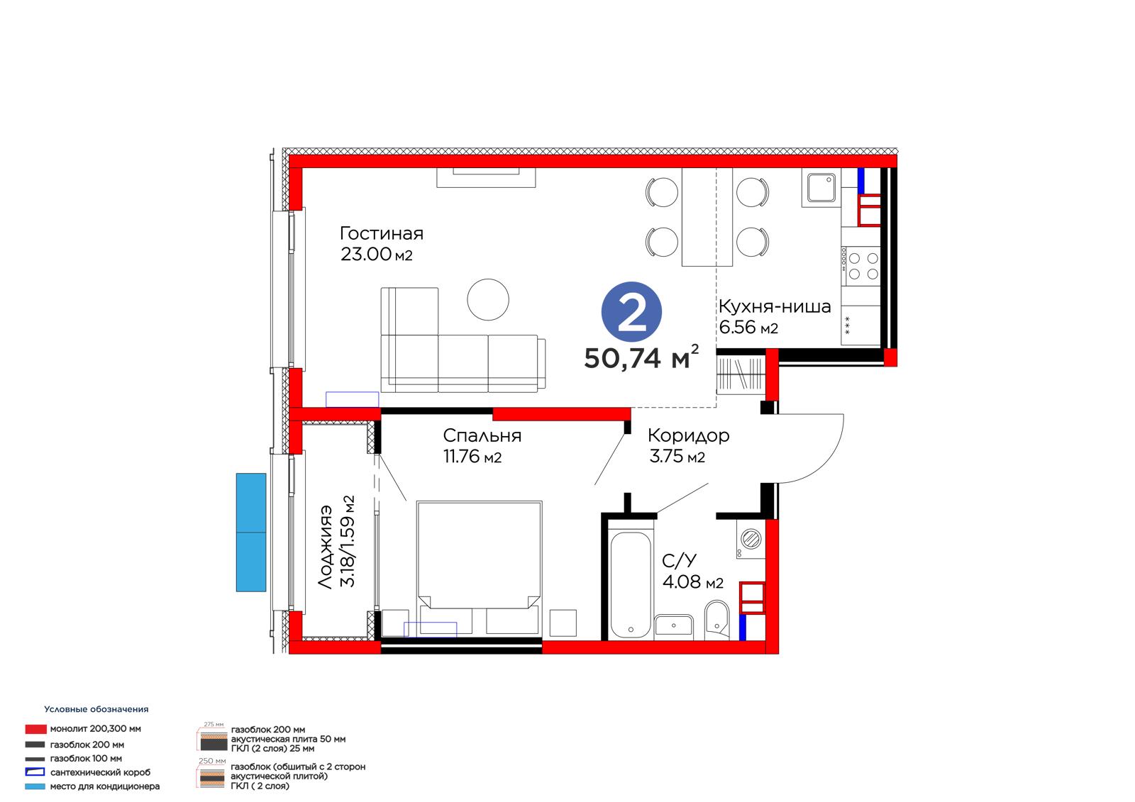 Площадь 50.74 м²