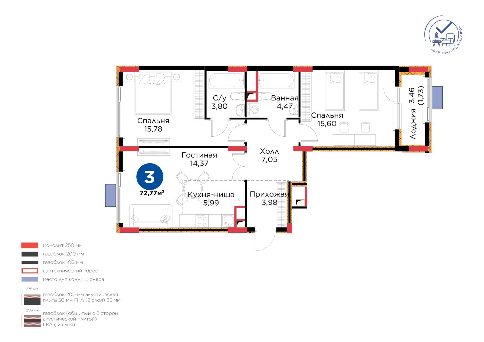 Продажа 3-комнатной квартиры в ЖК Auez Park, 72.77 м², г. Астана, ул. Ш. Калдаякова
