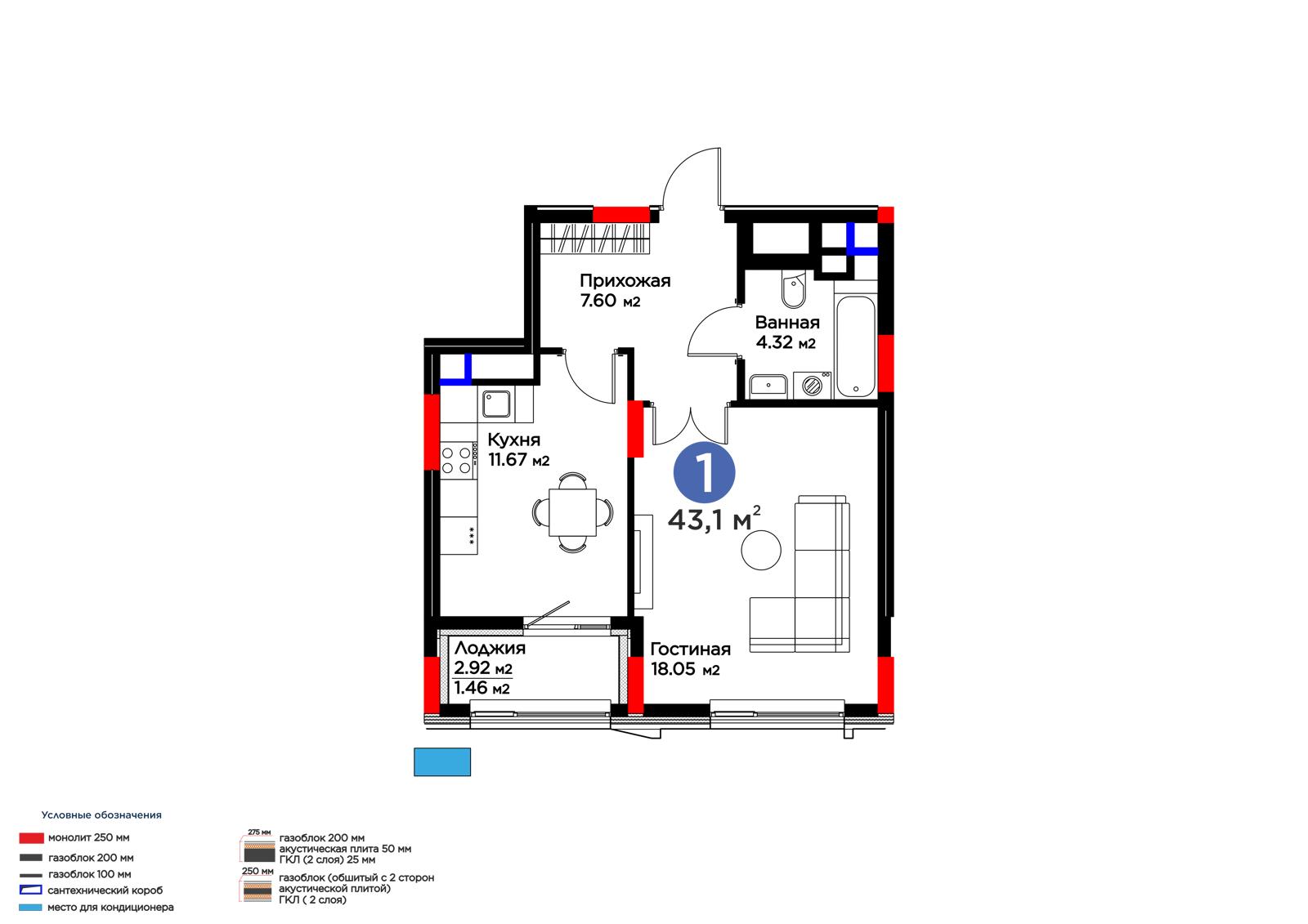Площадь 43.1 м²