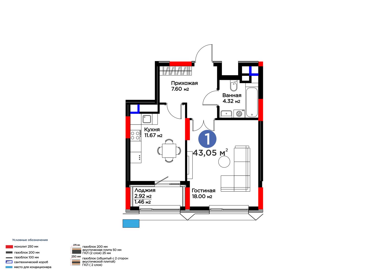 Площадь 43.05 м²