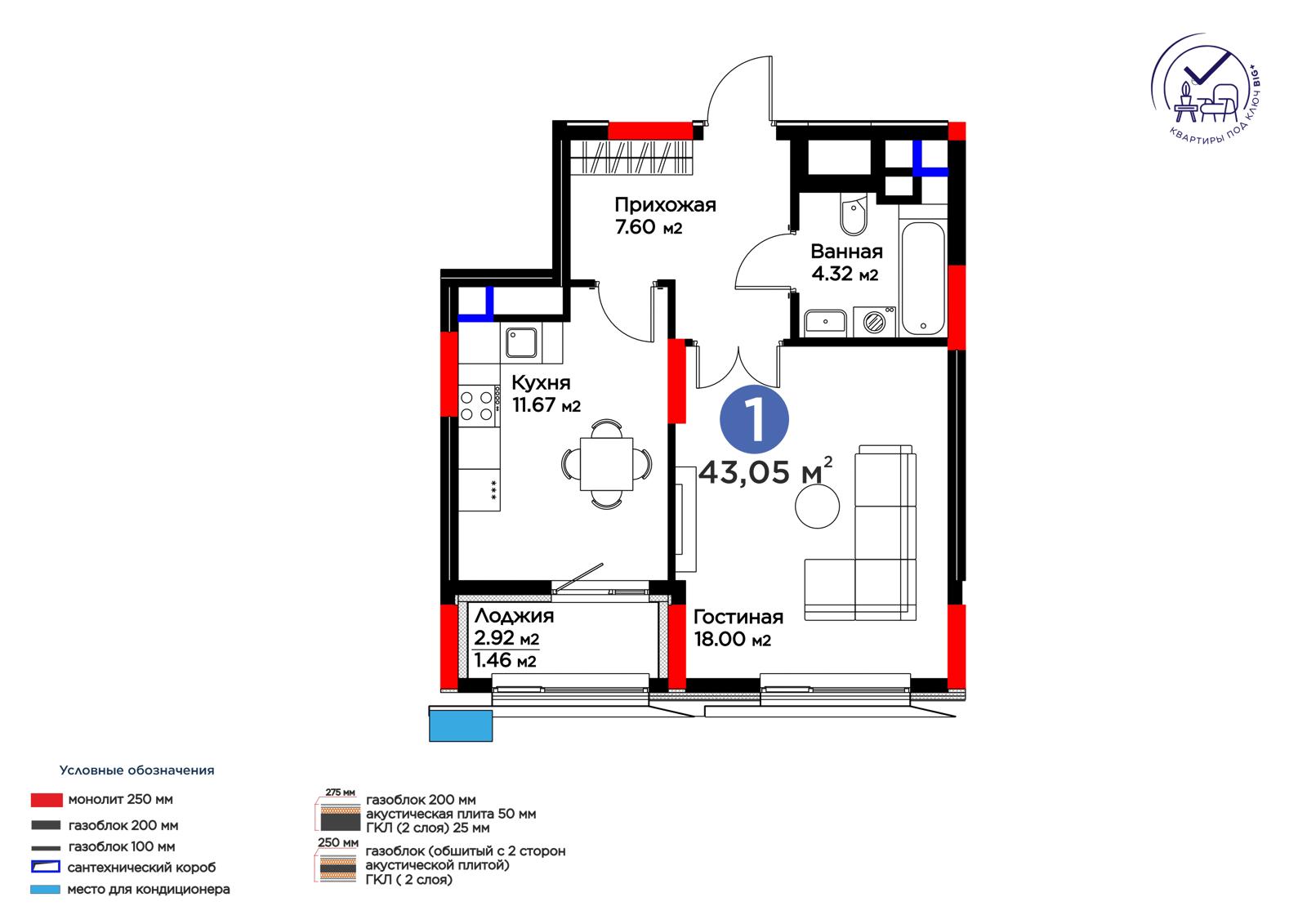 Продажа 1-комнатной квартиры , 43.05 м², г. Астана, ул. Хусейн бен Талал (31-я)