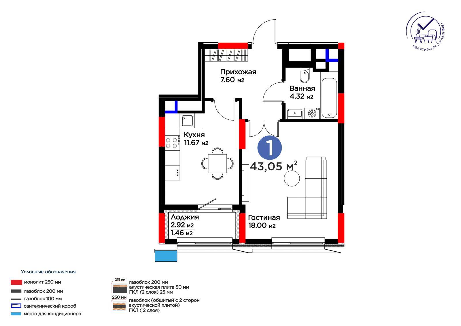 Площадь 43.05 м²
