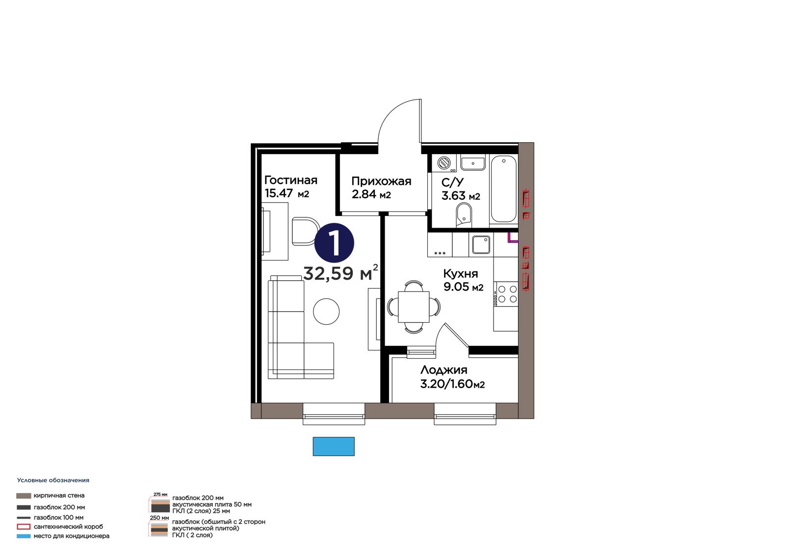 Площадь 32.59 м²