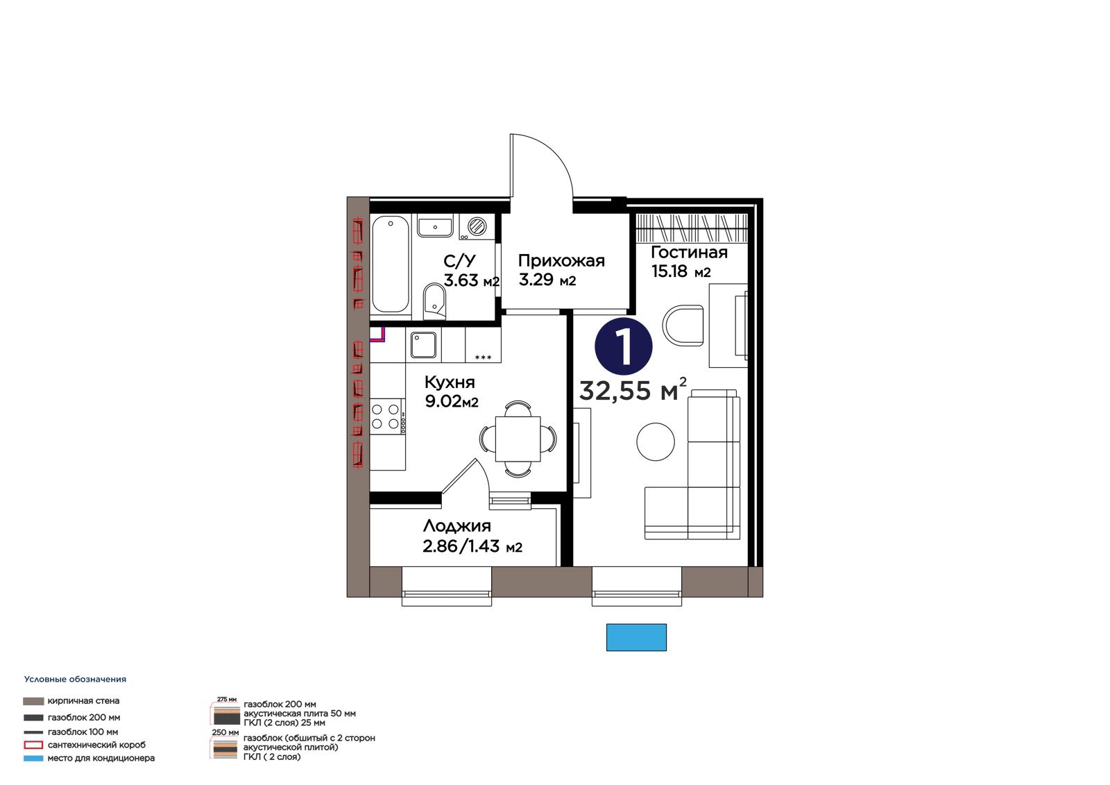 Площадь 32.55 м²