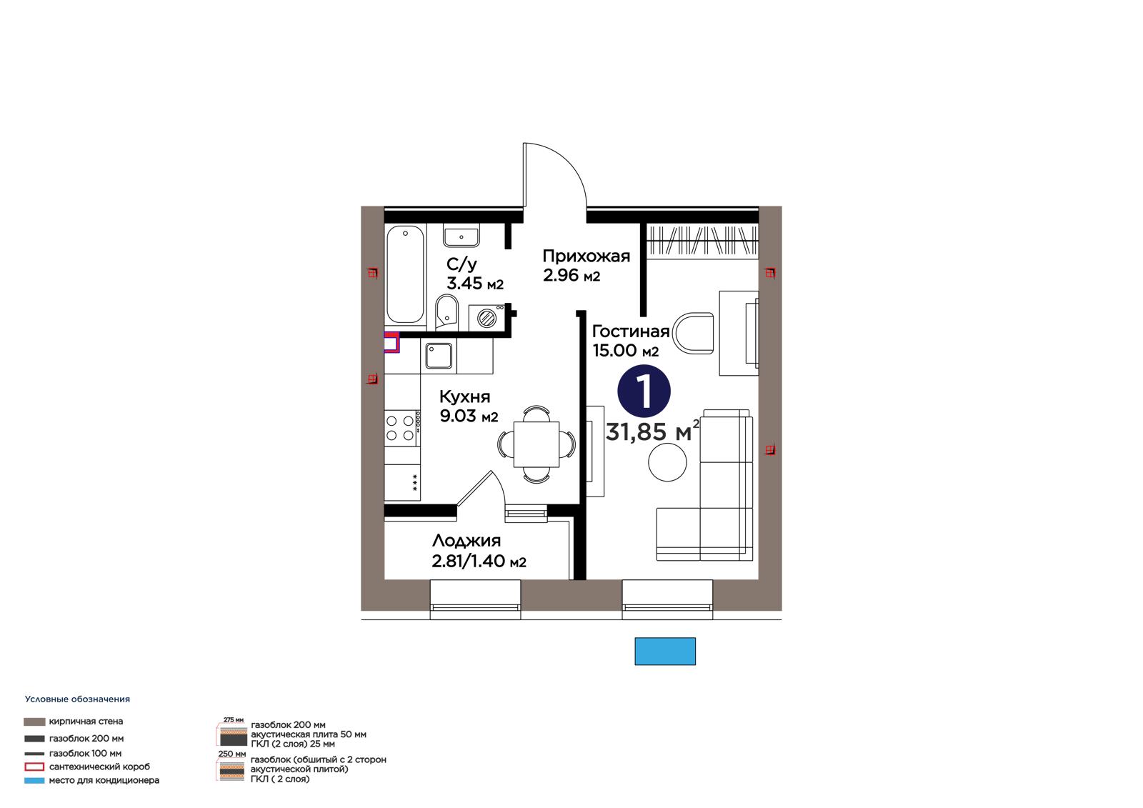 Продажа 1-комнатной квартиры в ЖК OİU, 31.85 м², г. Астана