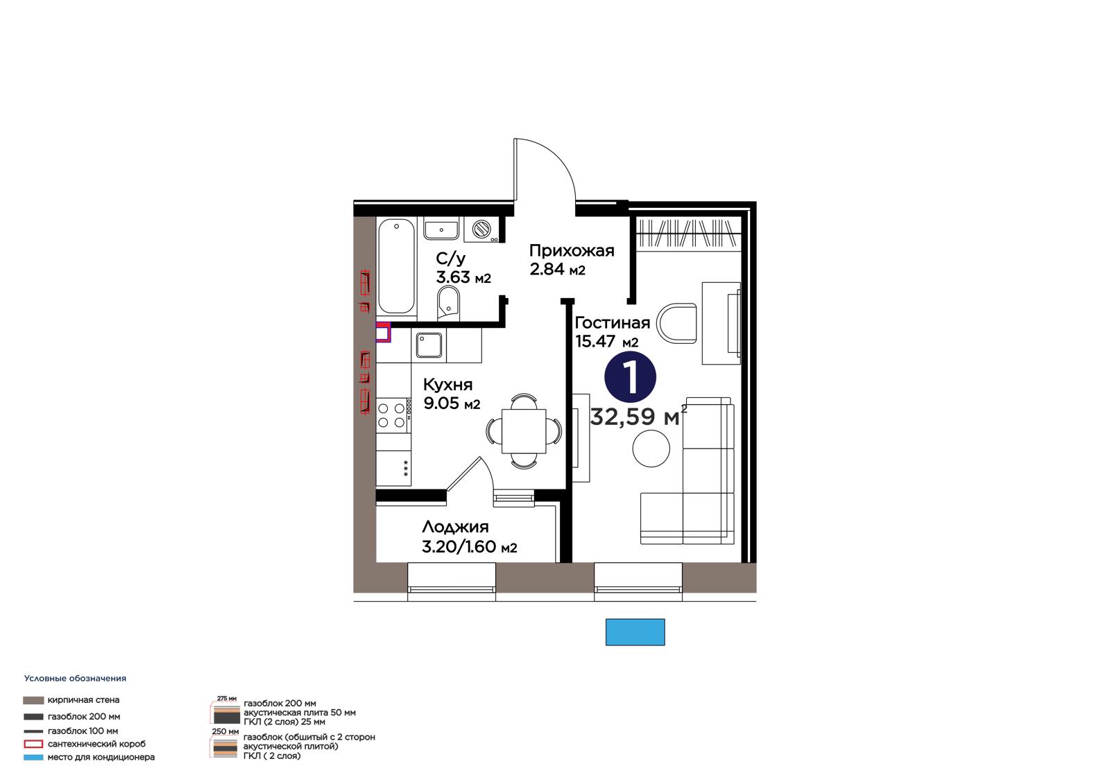 Продажа 1-комнатной квартиры в ЖК OİU, 32.59 м², г. Астана
