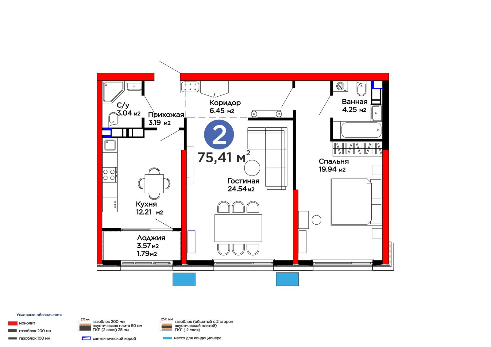 2-комн., 75.41 м², 3 этаж из 9 г. Алматы, Бостандыкский район, ул. Егизбаева 9/1 ЖК Verdi
