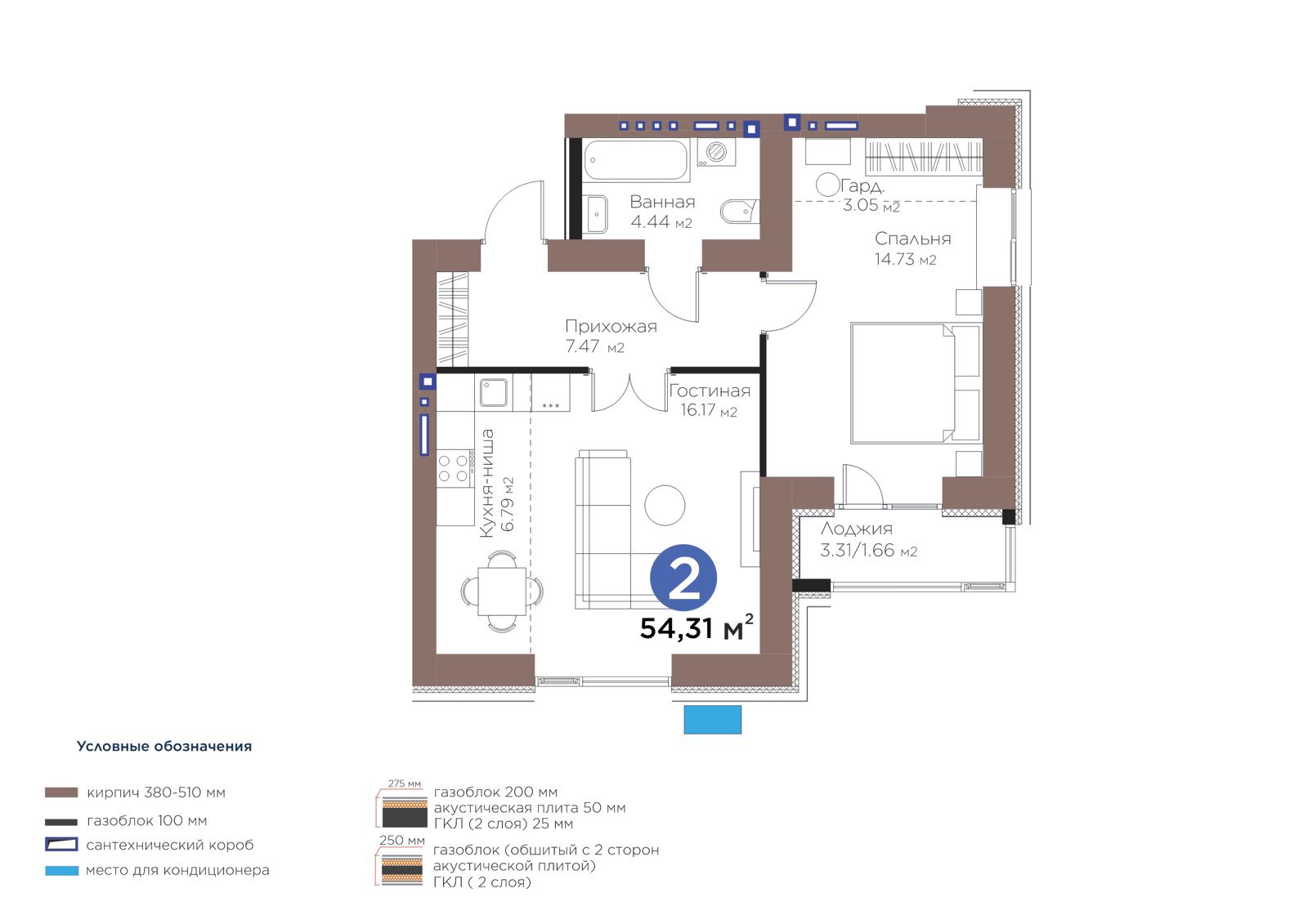 2-комн., 54.31 м², 7 этаж из 9 г. Астана, Есильский район, ул. Улы дала ЖК Jetisu Satti