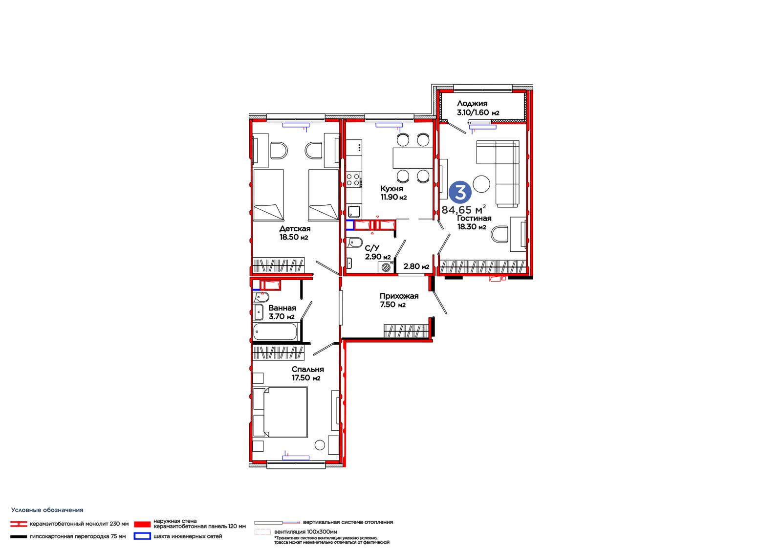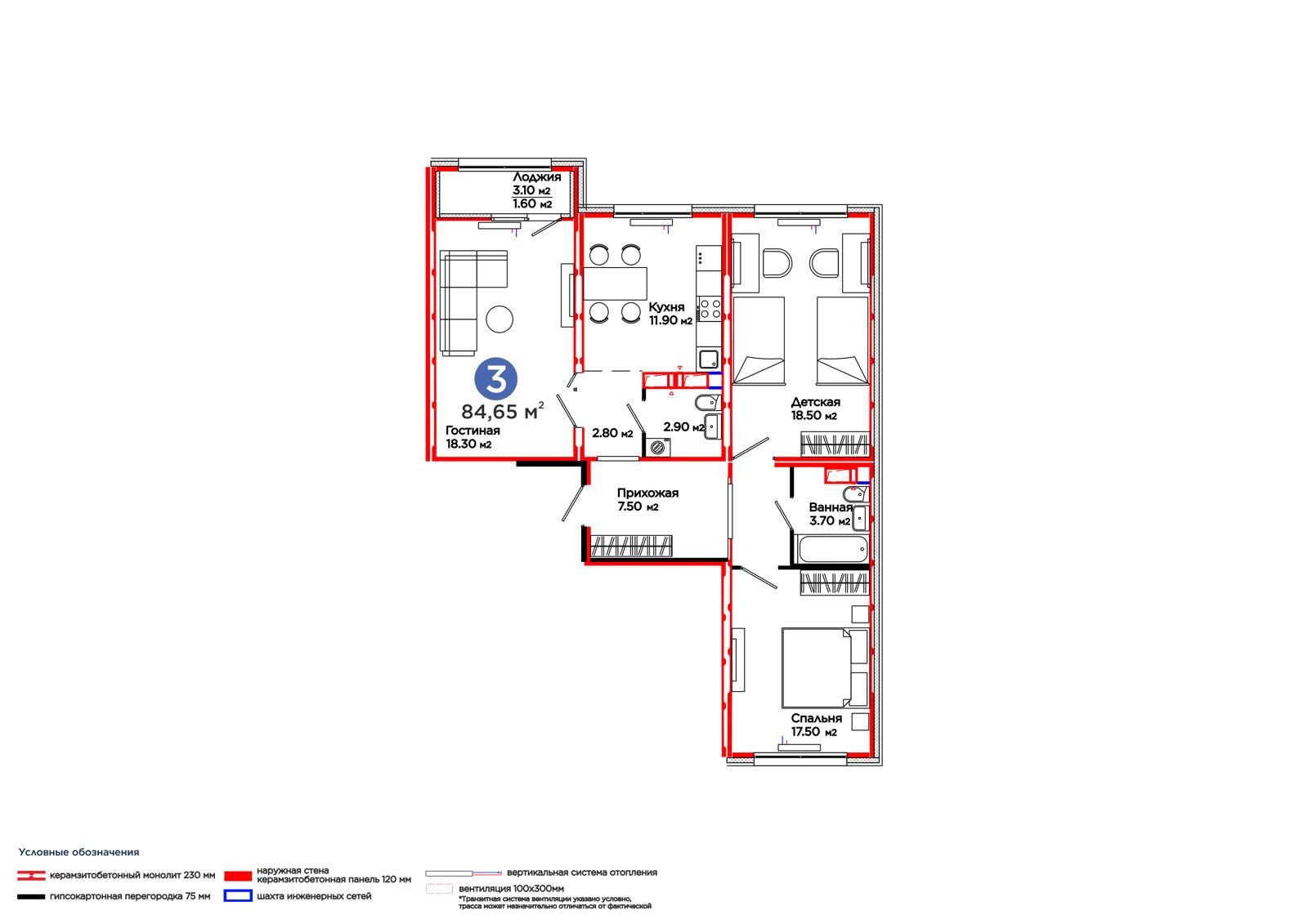 3-комн., 84.8 м², 7 этаж из 12 г. Астана, Сарыаркинский район, ул. С 902 ЖК PARKLAND