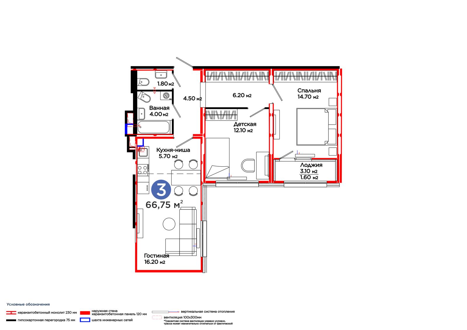 3-комн., 66.75 м², 16 этаж из 16 г. Астана, Сарыаркинский район, ул. С 902 ЖК PARKLAND