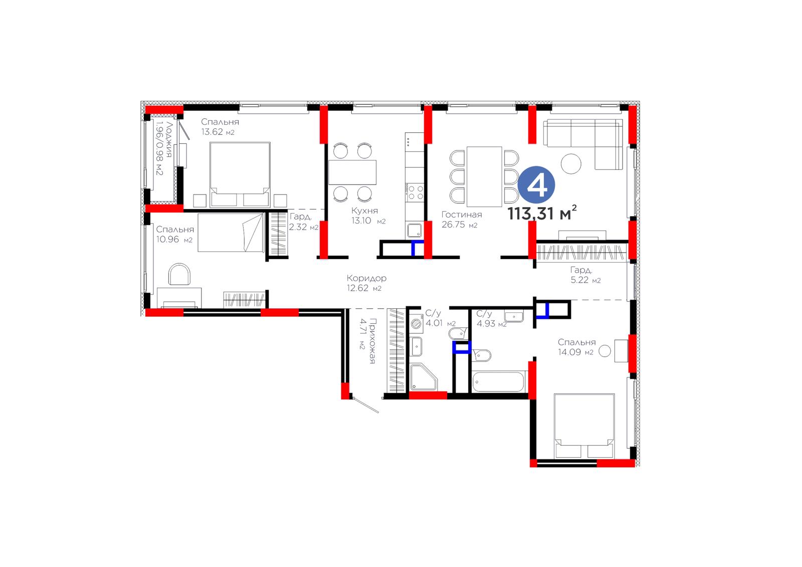 4-комн., 113.31 м², 13 этаж из 17 г. Астана, ул. Улы дала ЖК ŪIA.BIRLIK