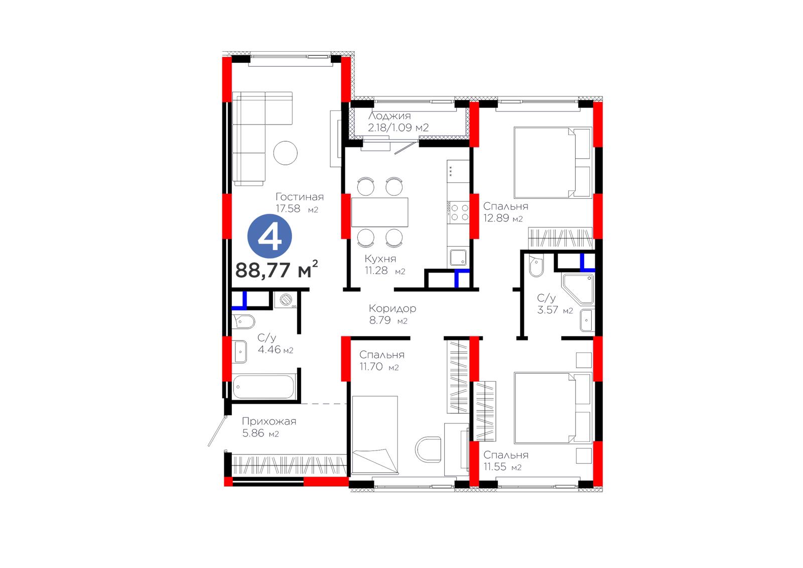 4-комн., 88.77 м², 3 этаж из 17 г. Астана, ул. Улы дала ЖК ŪIA.BIRLIK