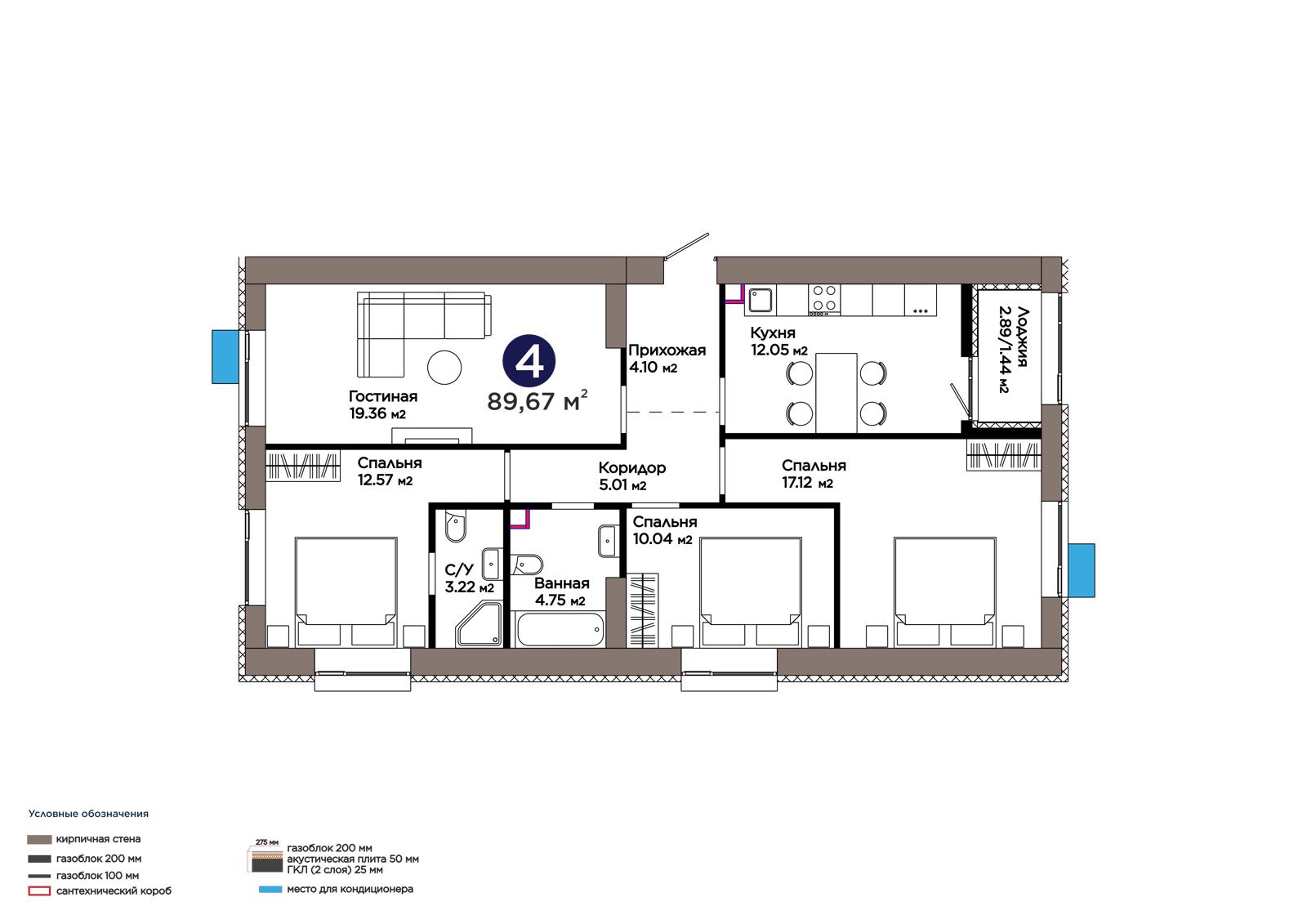 4-комн., 89.67 м², 4 этаж из 9 г. Астана, ЖК Lavita