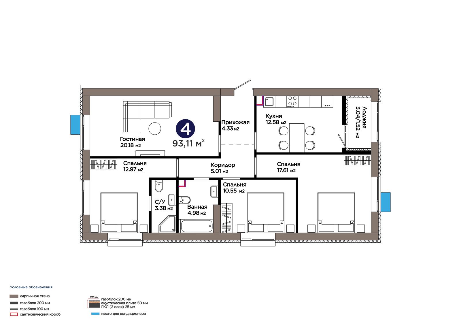 4-комн., 93.11 м², 6 этаж из 9 г. Астана, ЖК Lavita
