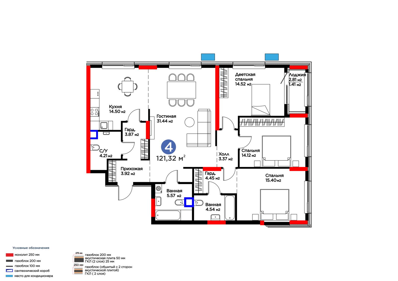 4-комн., 121.22 м², 17 этаж из 17 г. Астана, ул. Хусейн бен Талал (31-я) ЖК MOD Ultra