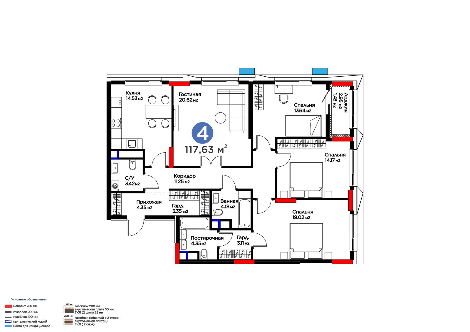 4-комн., 117.63 м², 9 этаж из 17 г. Астана, ул. Хусейн бен Талал (31-я) ЖК MOD Ultra