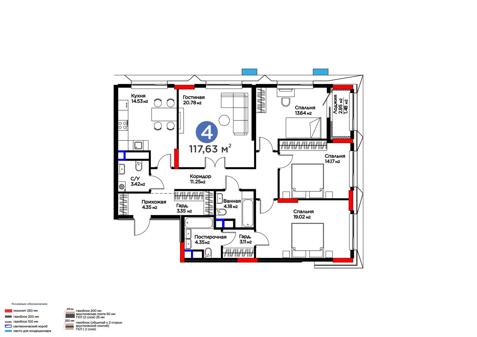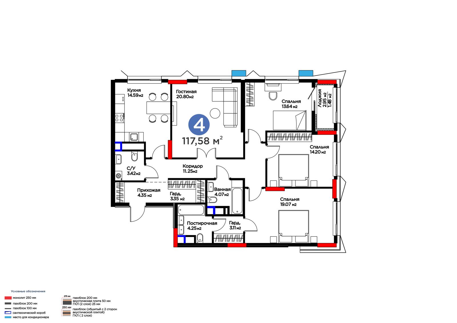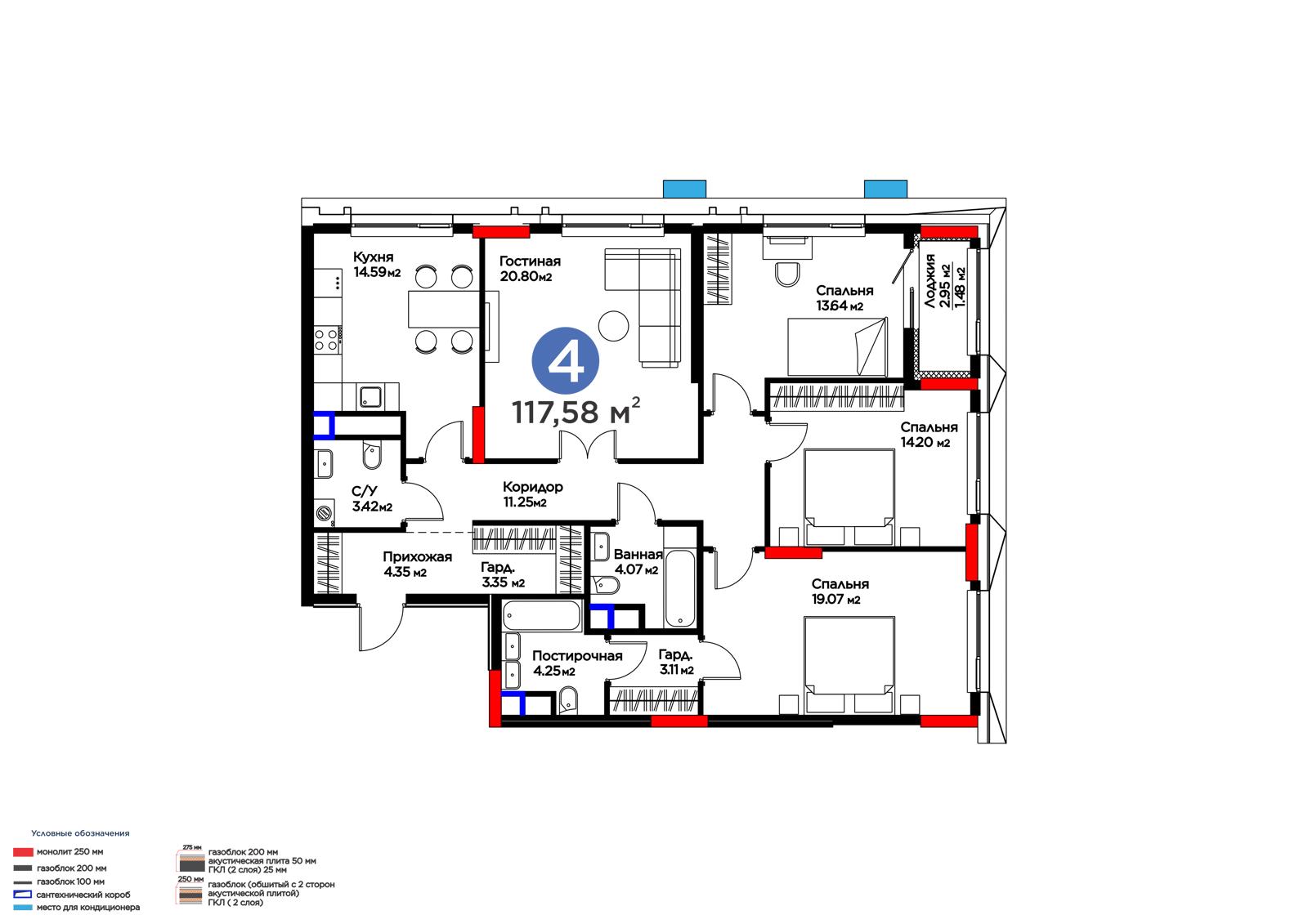 4-комн., 117.13 м², 7 этаж из 17 г. Астана, ул. Хусейн бен Талал (31-я) ЖК MOD Ultra