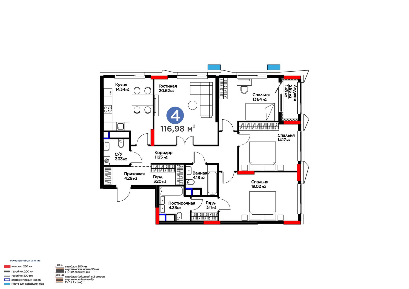 4-комн., 116.98 м², 3 этаж из 17 г. Астана, ул. Хусейн бен Талал (31-я) ЖК MOD Ultra