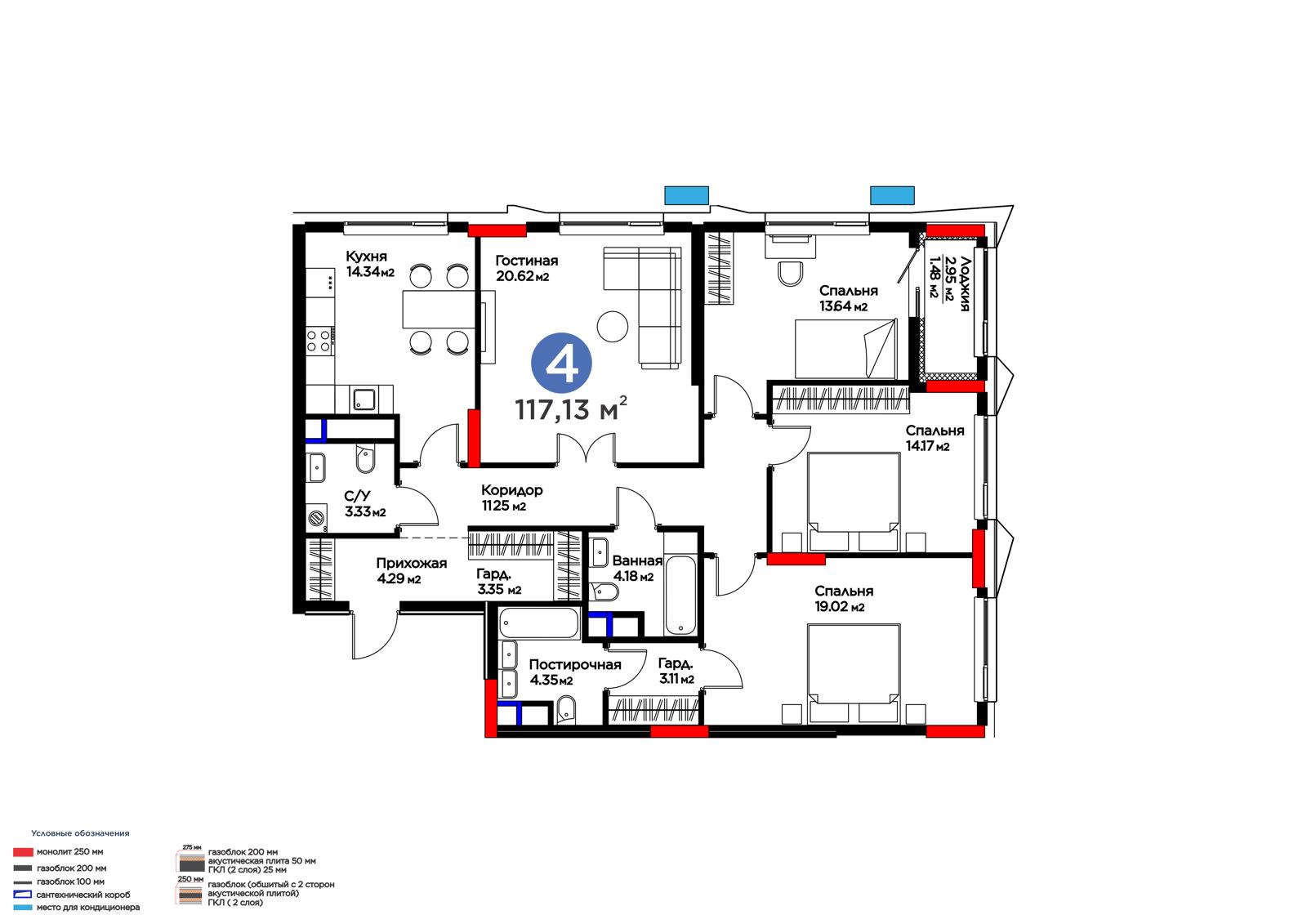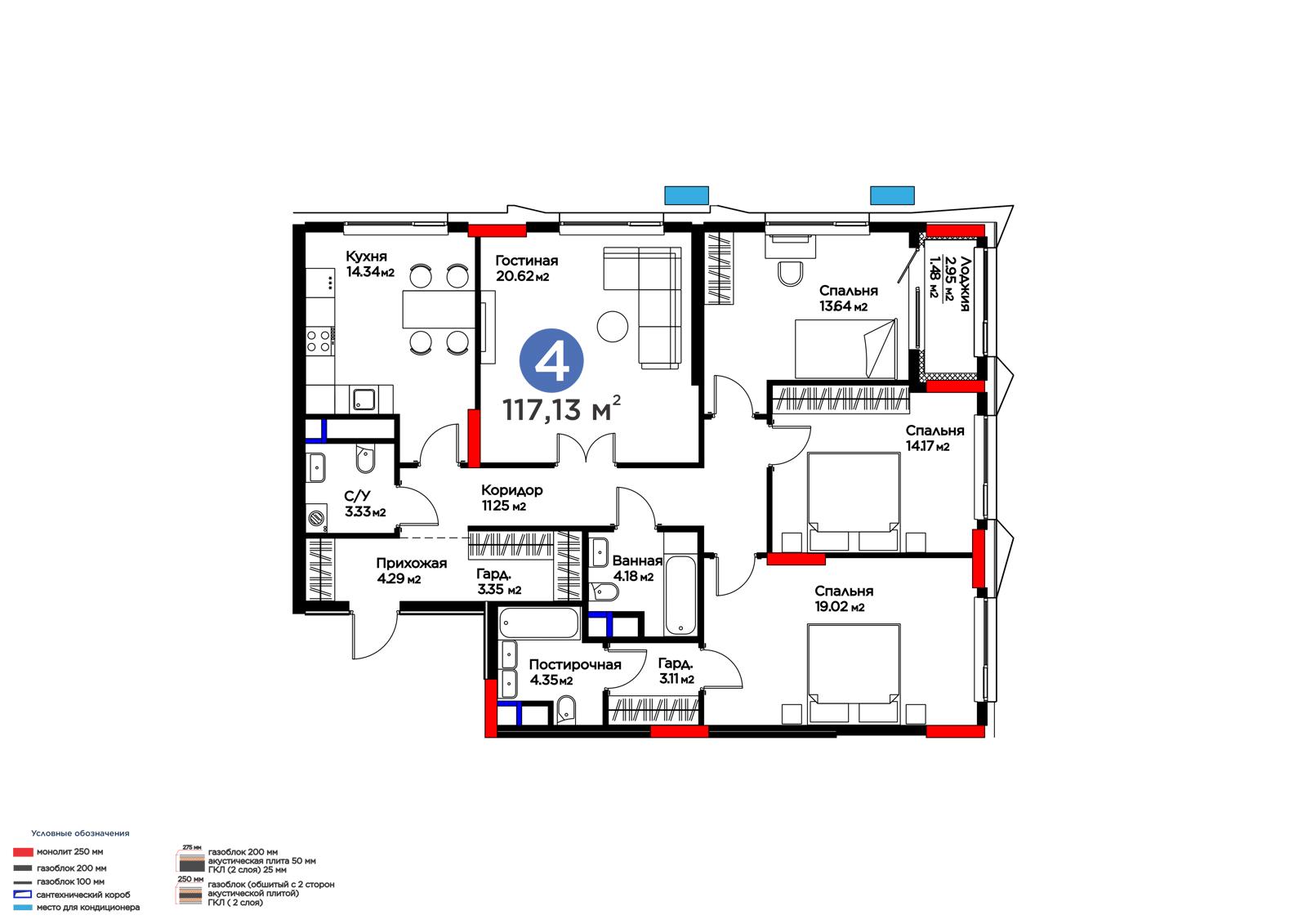 4-комн., 117.13 м², 4 этаж из 17 г. Астана, ул. Хусейн бен Талал (31-я)