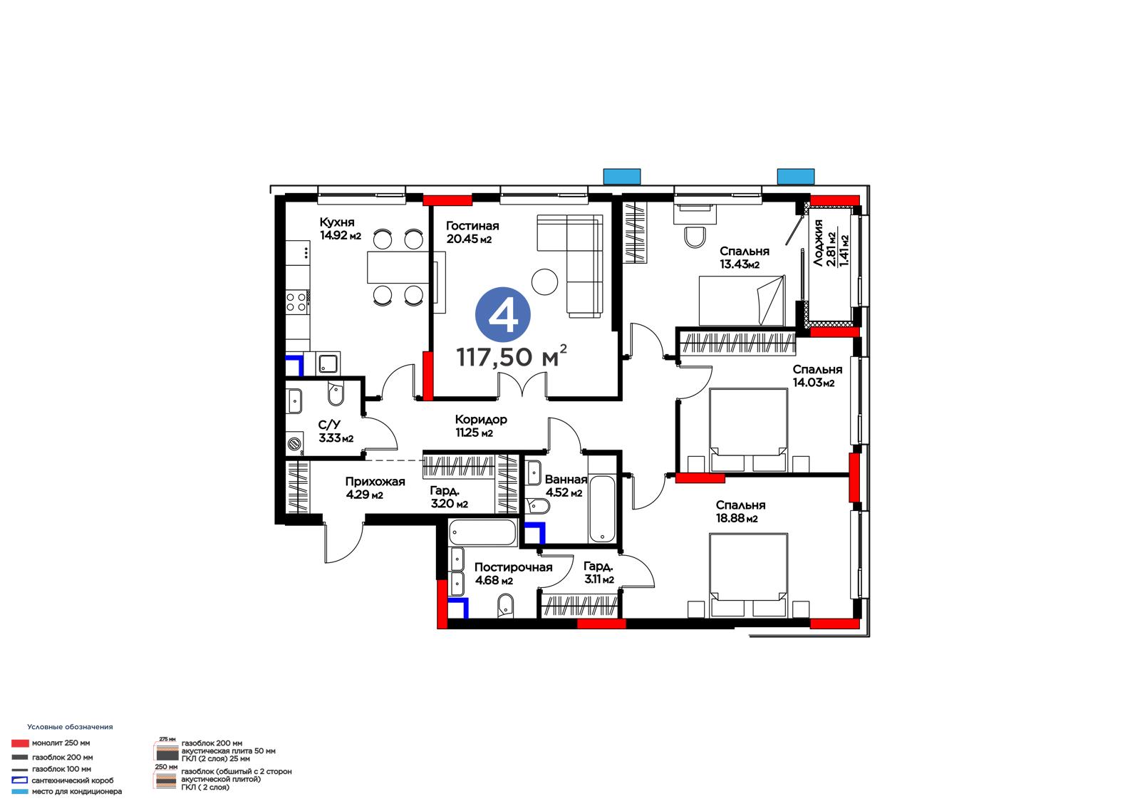 4-комн., 117.13 м², 5 этаж из 17 г. Астана, ул. Хусейн бен Талал (31-я) ЖК MOD Ultra
