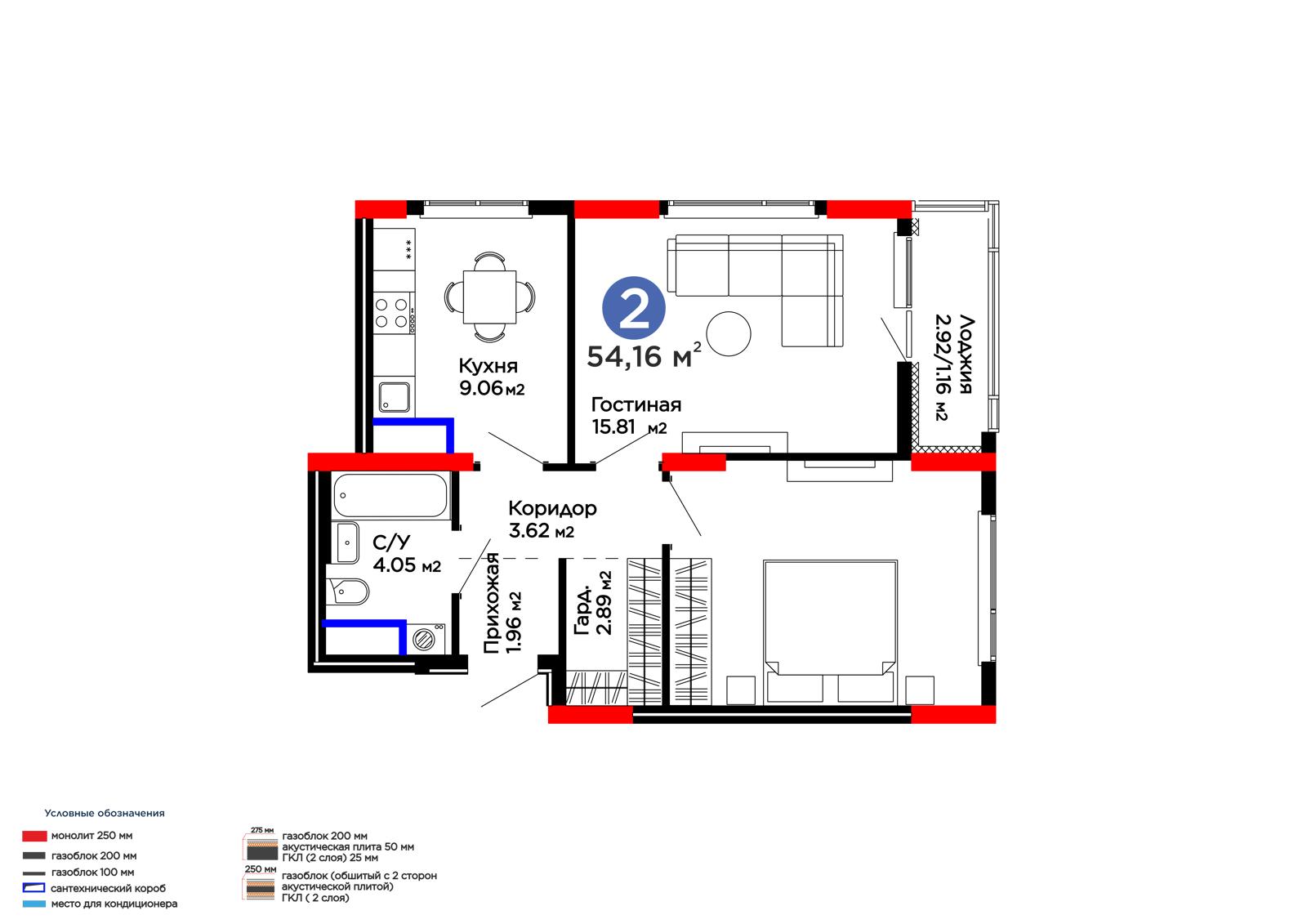 2-комн., 54.16 м², 6 этаж из 12 г. Астана, ул. Чингиза Айтматова ЖК BAIZAMAN