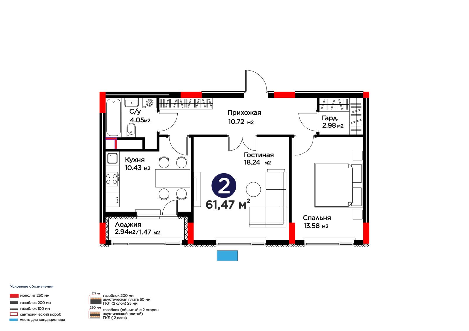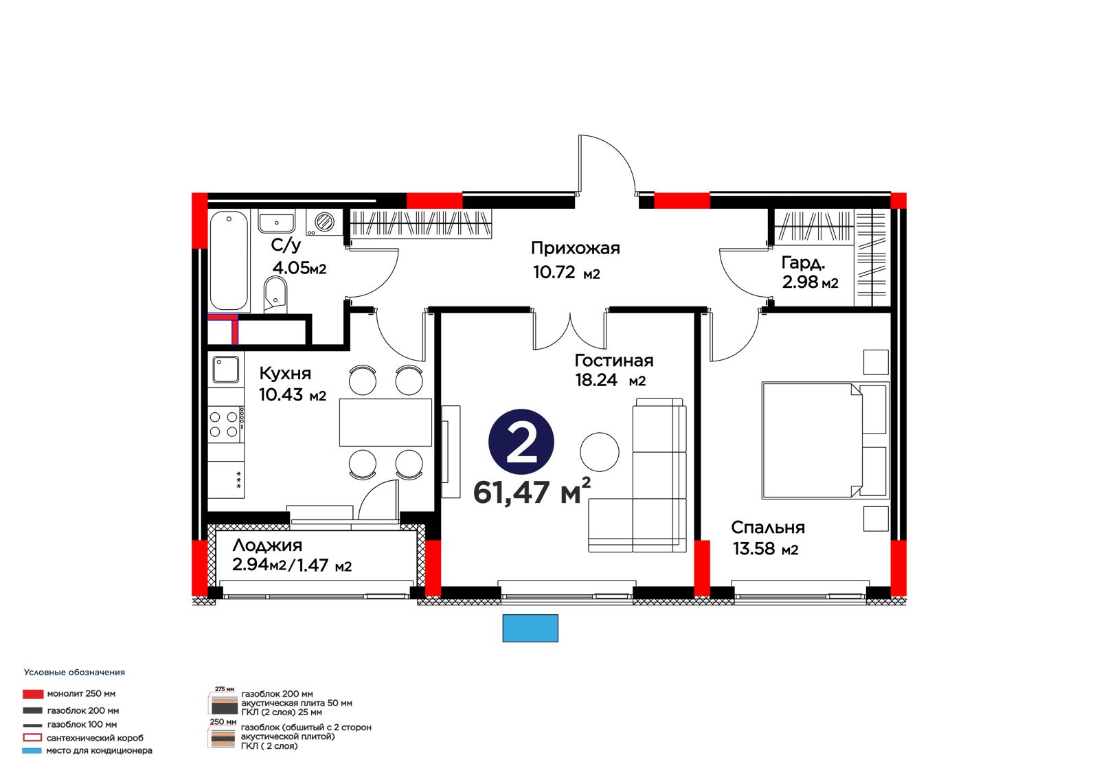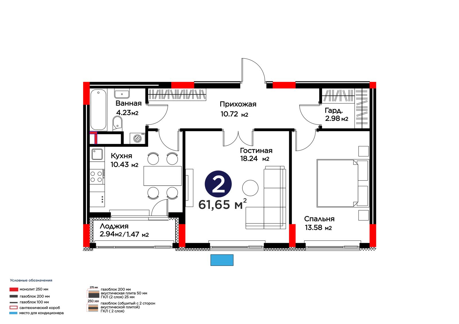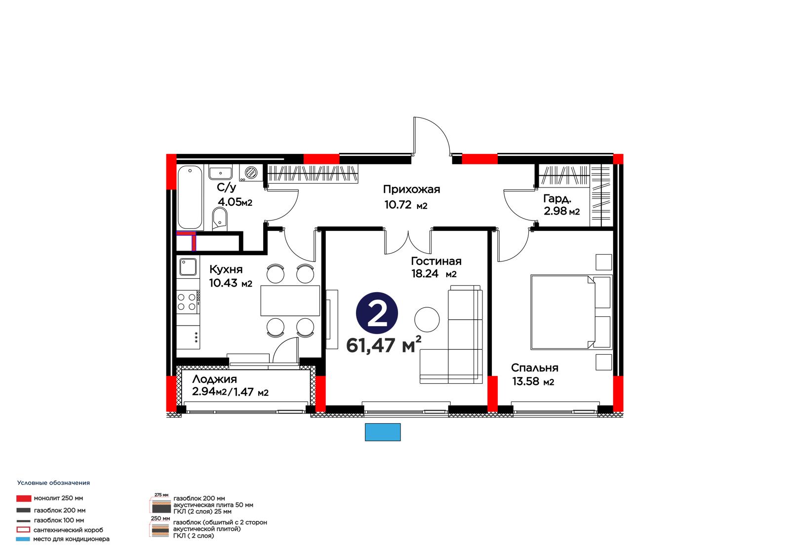 2-комн., 61.47 м², 8 этаж из 9 г. Астана, ЖК Lavita