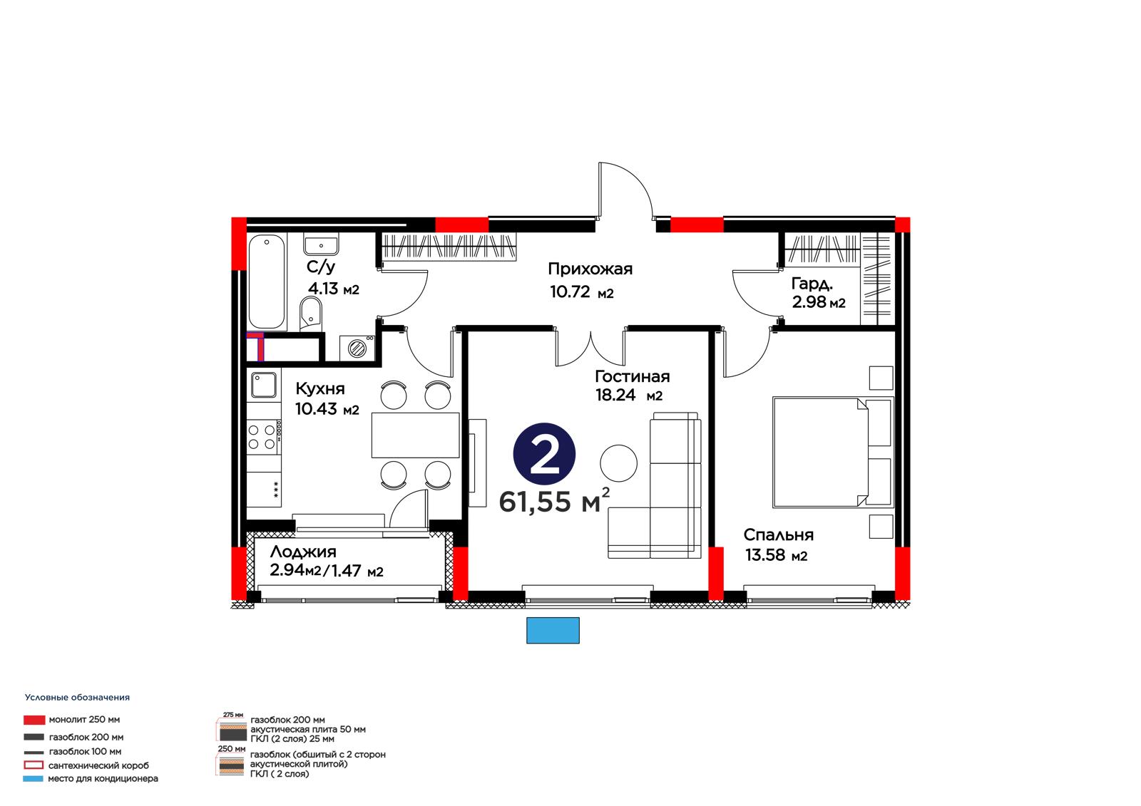 2-комн., 61.55 м², 4 этаж из 9 г. Астана, ЖК Lavita