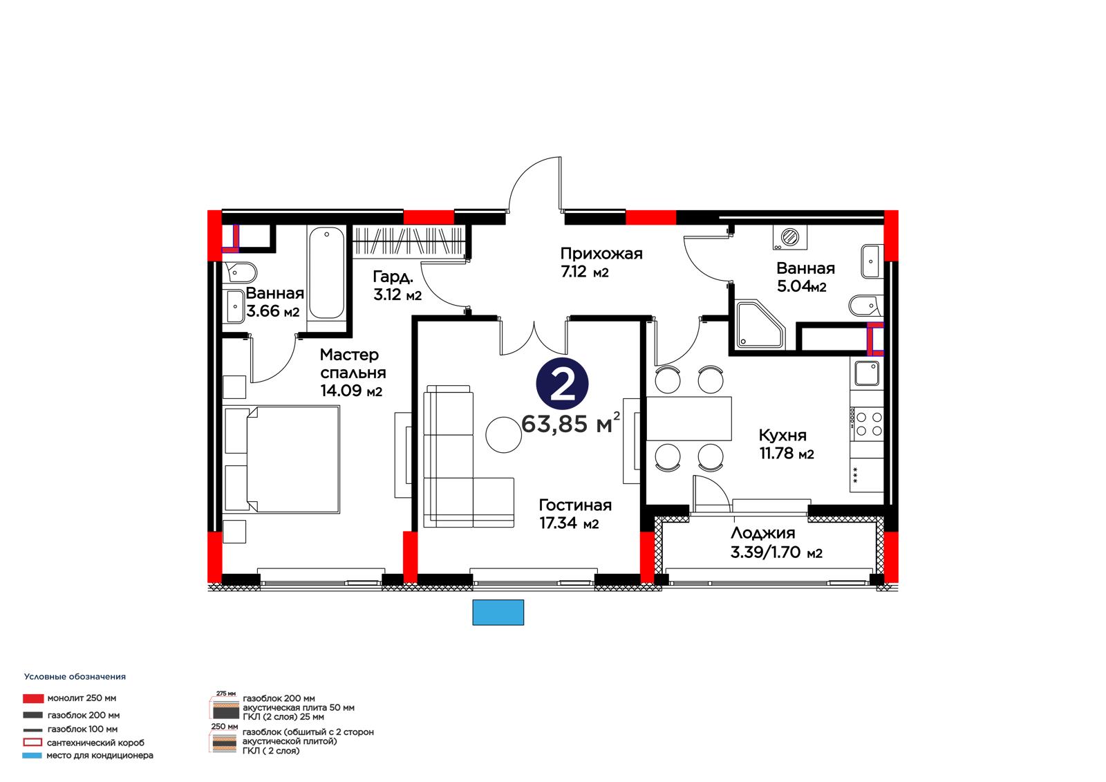 2-комн., 63.85 м², 6 этаж из 9 г. Астана, ЖК Lavita