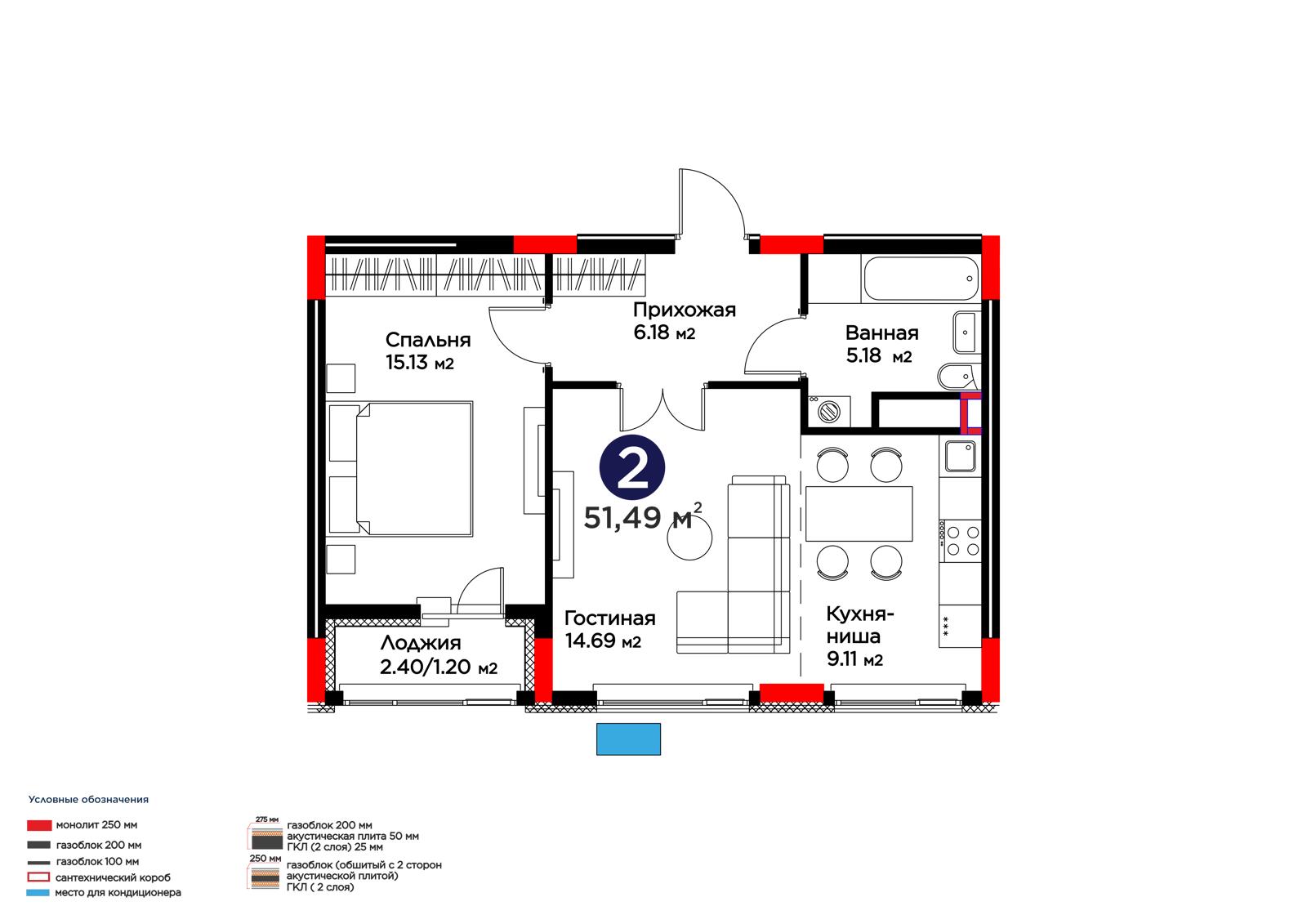 2-комн., 51.49 м², 9 этаж из 9 г. Астана, ЖК Lavita
