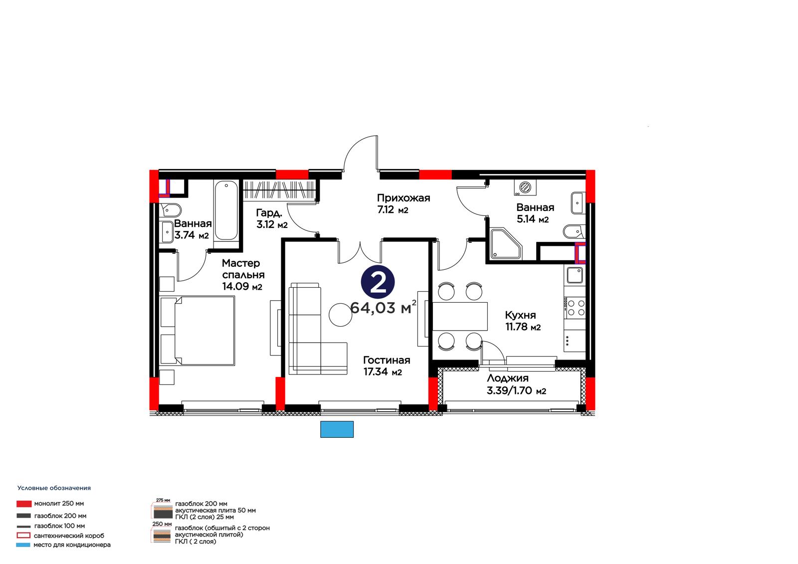 2-комн., 64.03 м², 5 этаж из 9 г. Астана, ЖК Lavita
