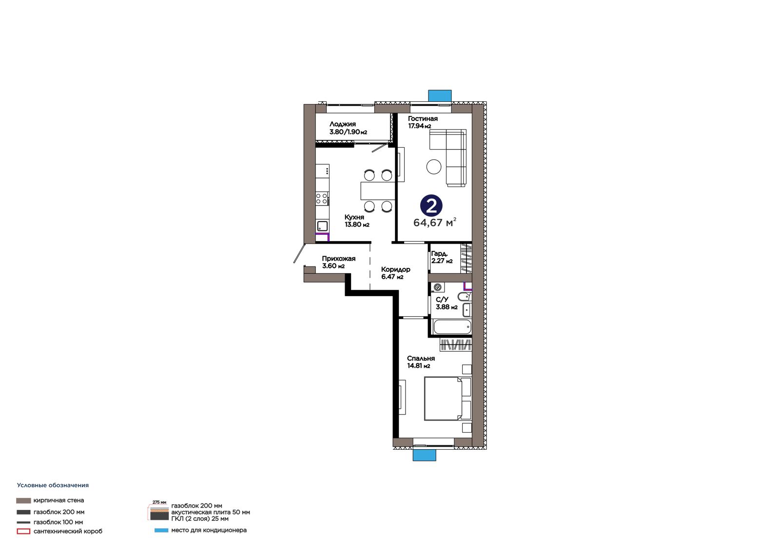 2-комн., 64.67 м², 4 этаж из 9 г. Астана, ЖК Lavita