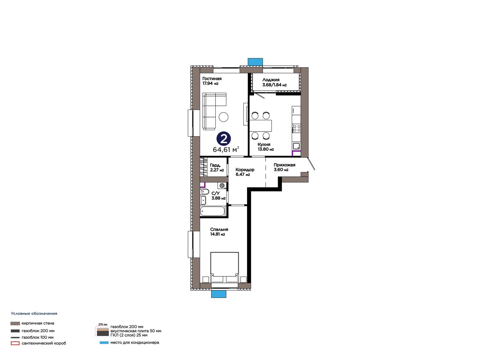2-комн., 64.61 м², 2 этаж из 9 г. Астана, ЖК Lavita