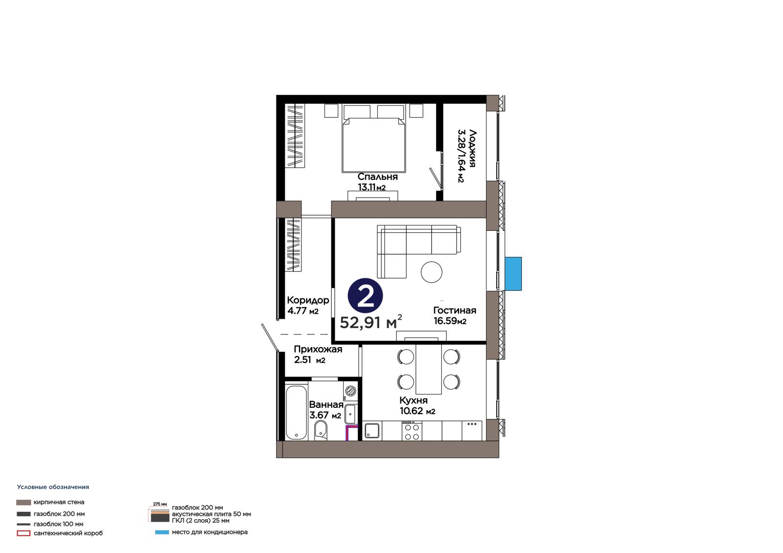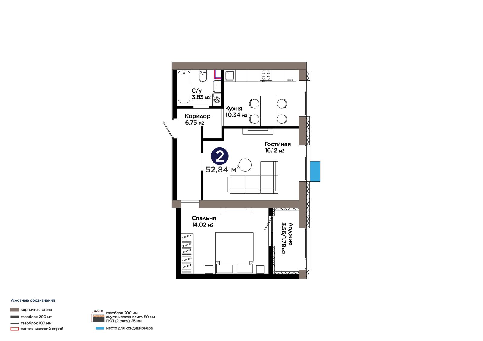 2-комн., 52.84 м², 6 этаж из 9 г. Астана, ЖК Lavita