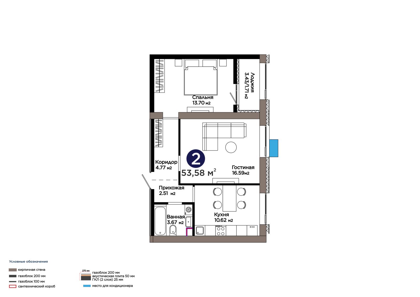 2-комн., 53.58 м², 6 этаж из 9 г. Астана, ЖК Lavita