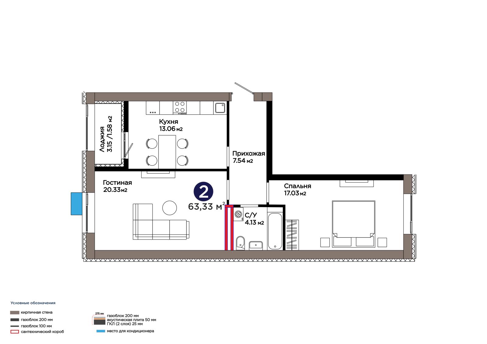2-комн., 63.33 м², 6 этаж из 9 г. Астана, ЖК Lavita