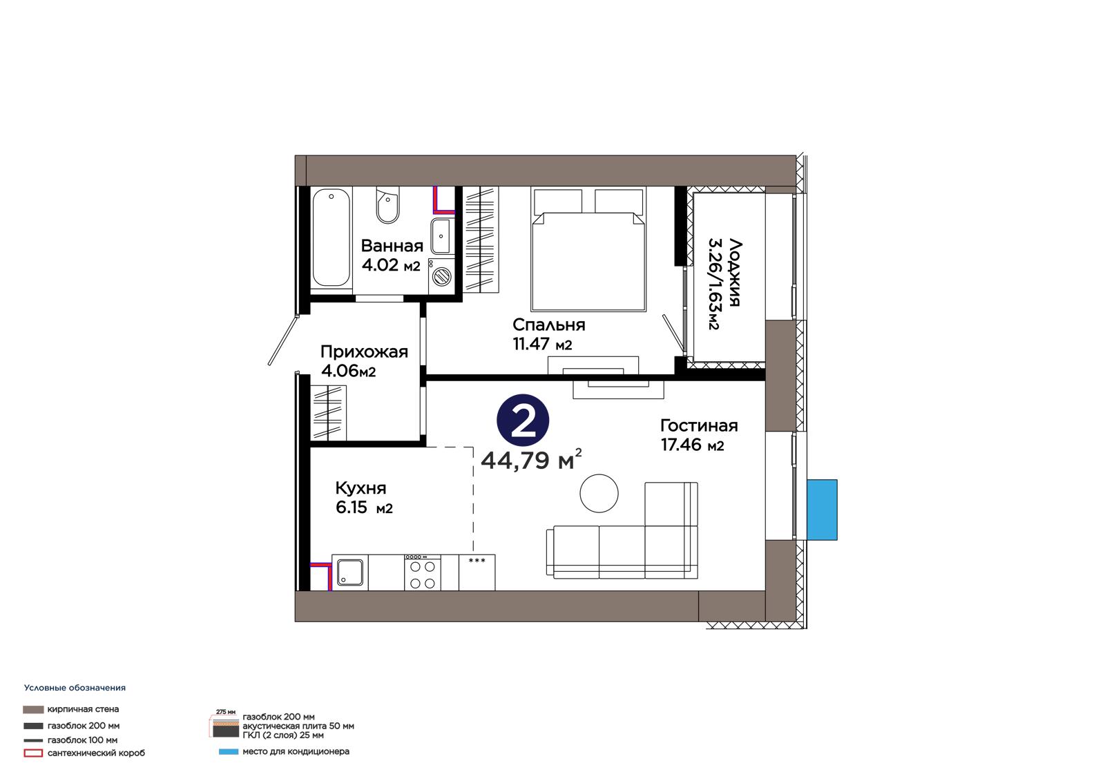 2-комн., 44.79 м², 5 этаж из 9 г. Астана, ЖК Lavita