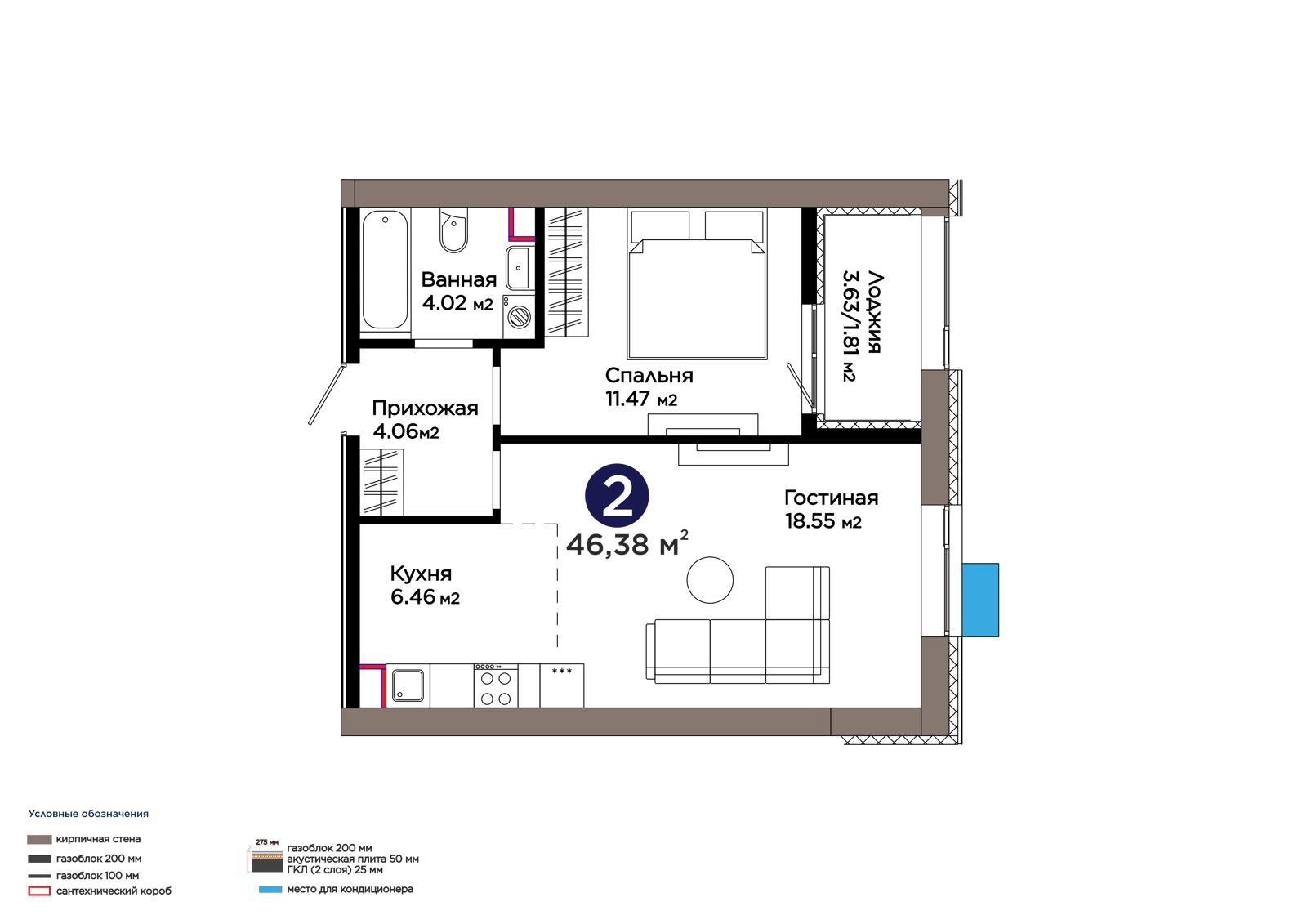2-комн., 46.38 м², 6 этаж из 9 г. Астана, ЖК Lavita