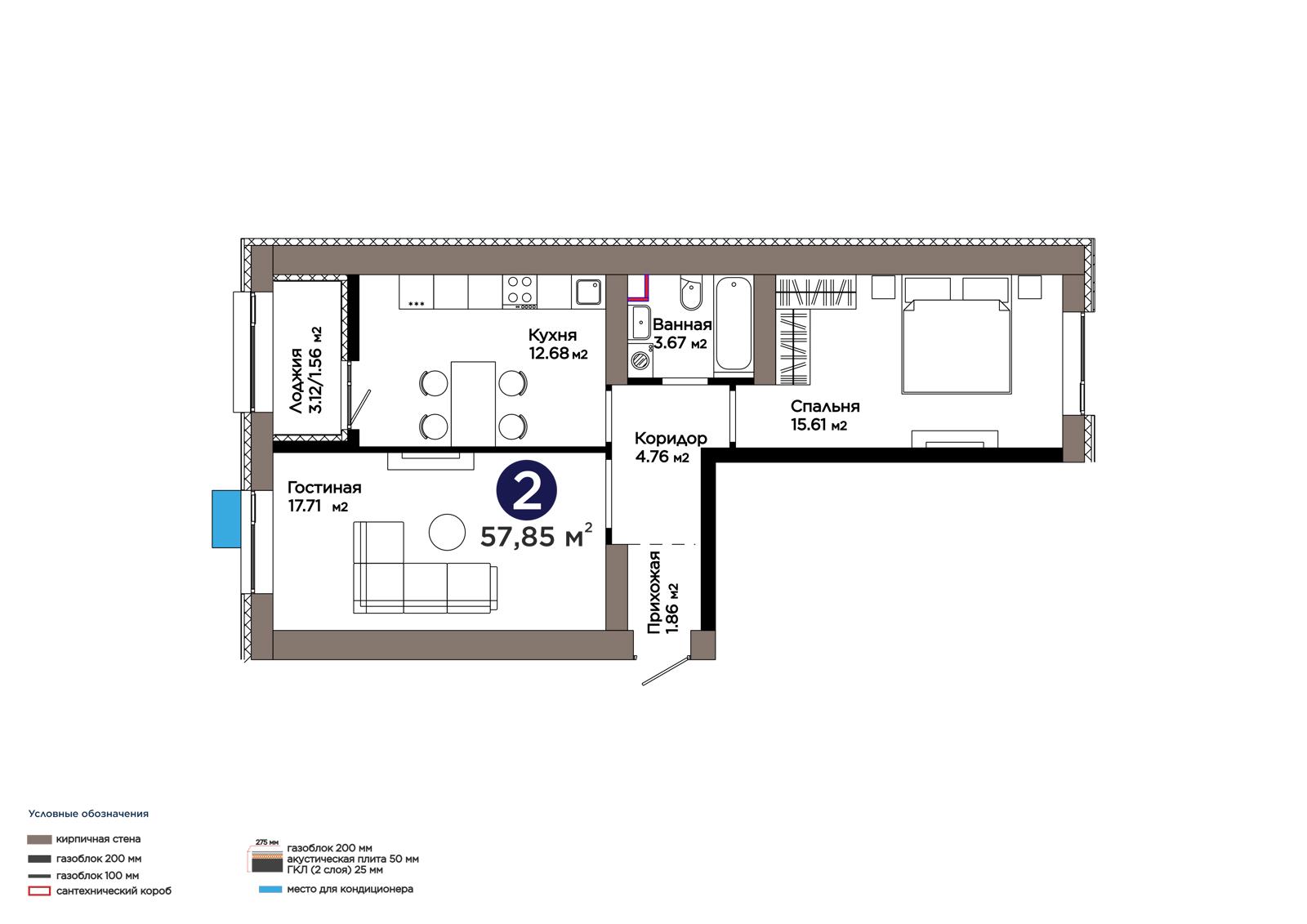 2-комн., 57.85 м², 3 этаж из 9 г. Астана, ЖК Lavita