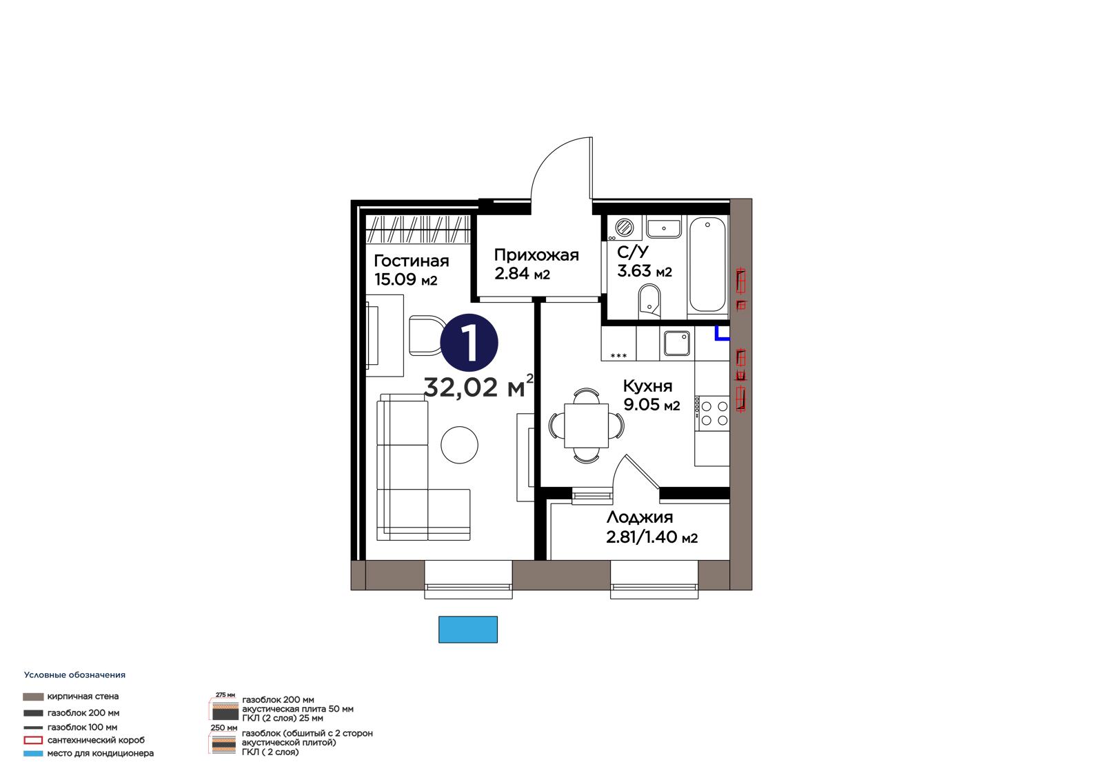 1-комн., 32.02 м², 5 этаж из 9 г. Астана, ЖК OİU