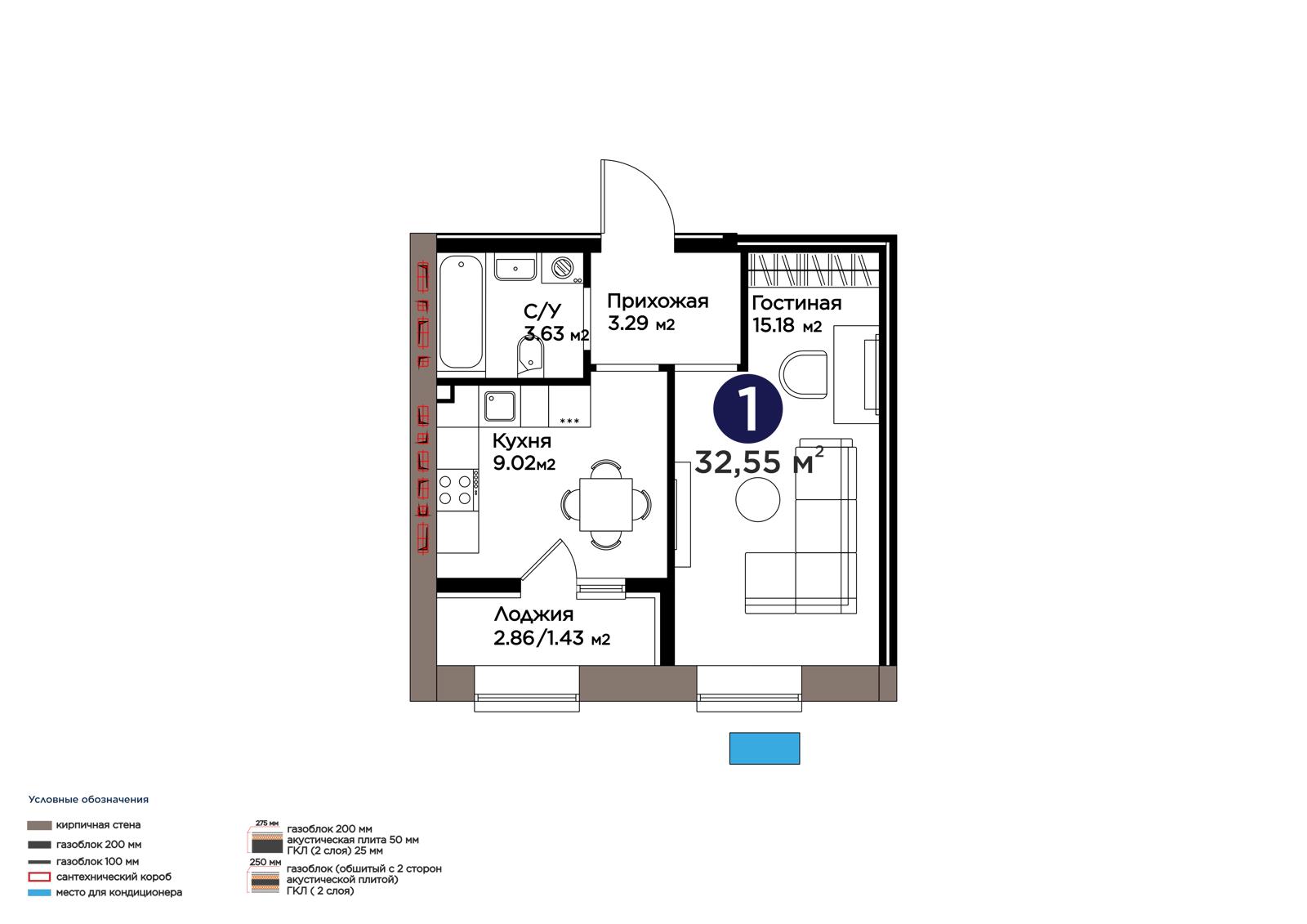 1-комн., 32.59 м², 8 этаж из 9 г. Астана, ЖК OİU