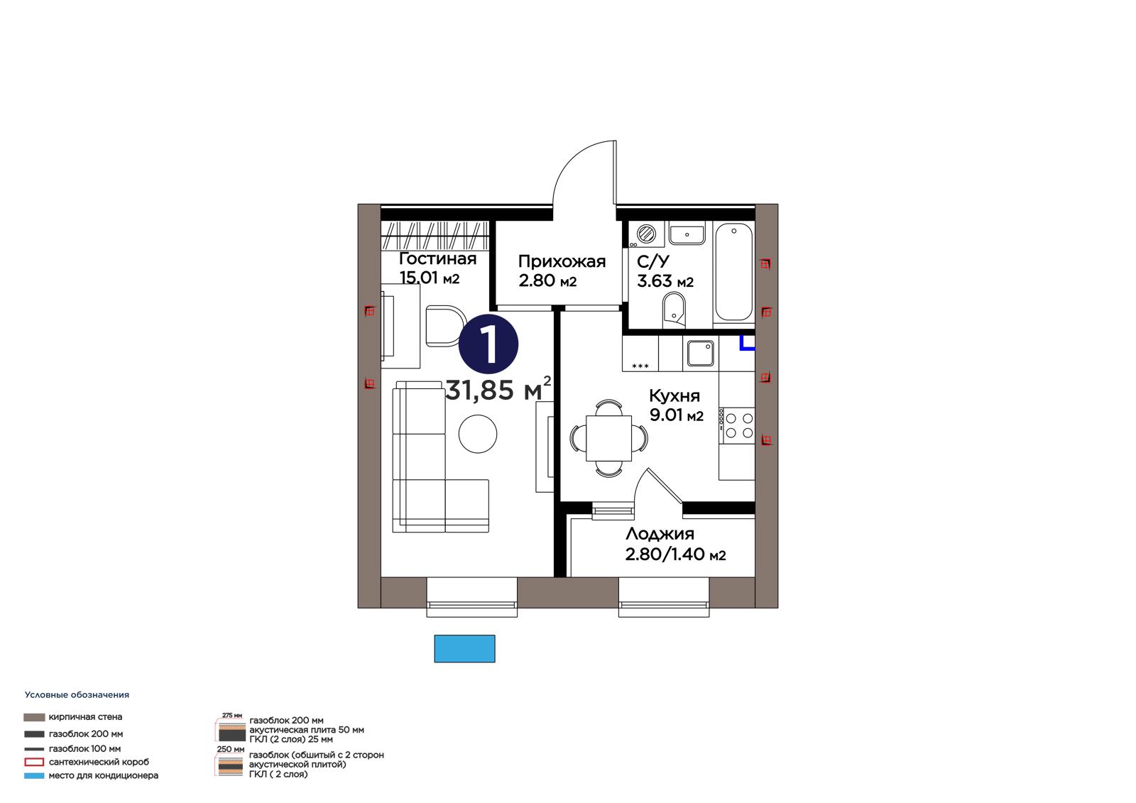 1-комн., 31.85 м², 4 этаж из 9 г. Астана, ЖК OİU