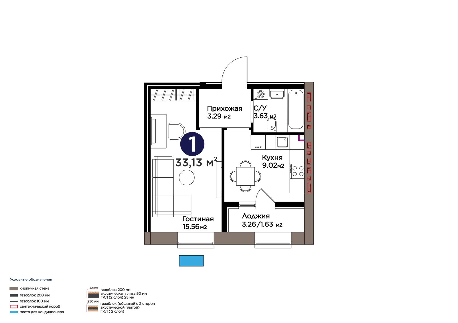 1-комн., 33.13 м², 7 этаж из 9 г. Астана, ЖК OİU