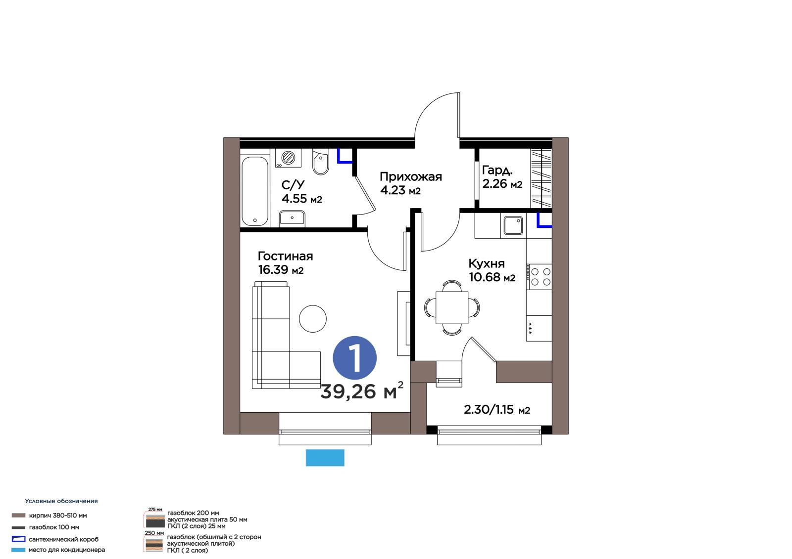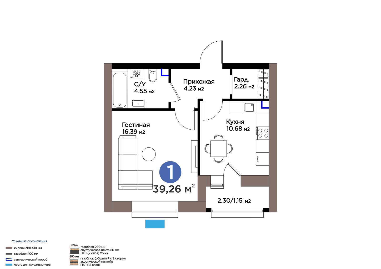 1-комн., 39.26 м², 2 этаж из 9 г. Астана, ул. М. Жумабаева ЖК IZBASAR