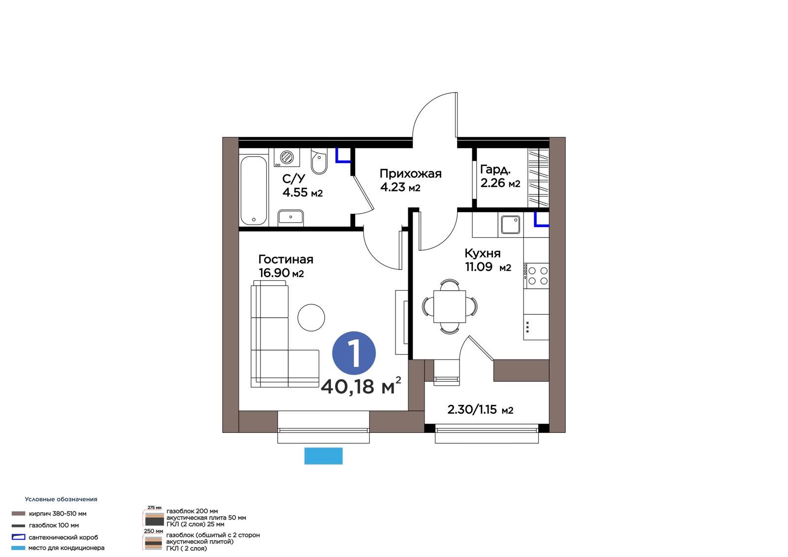 1-комн., 40.18 м², 8 этаж из 9 г. Астана, ул. М. Жумабаева ЖК IZBASAR