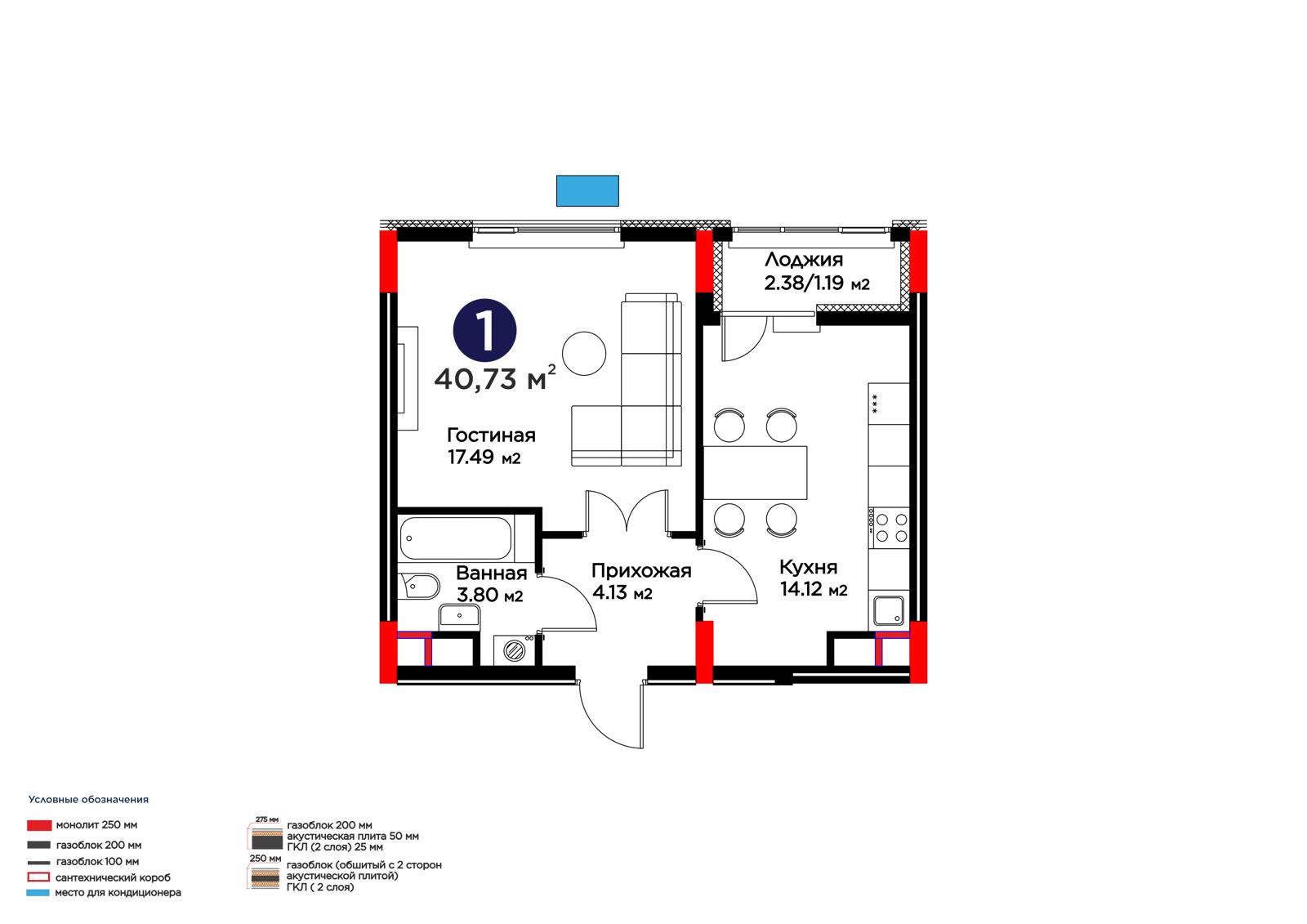 1-комн., 40.73 м², 7 этаж из 9 г. Астана, ЖК Lavita