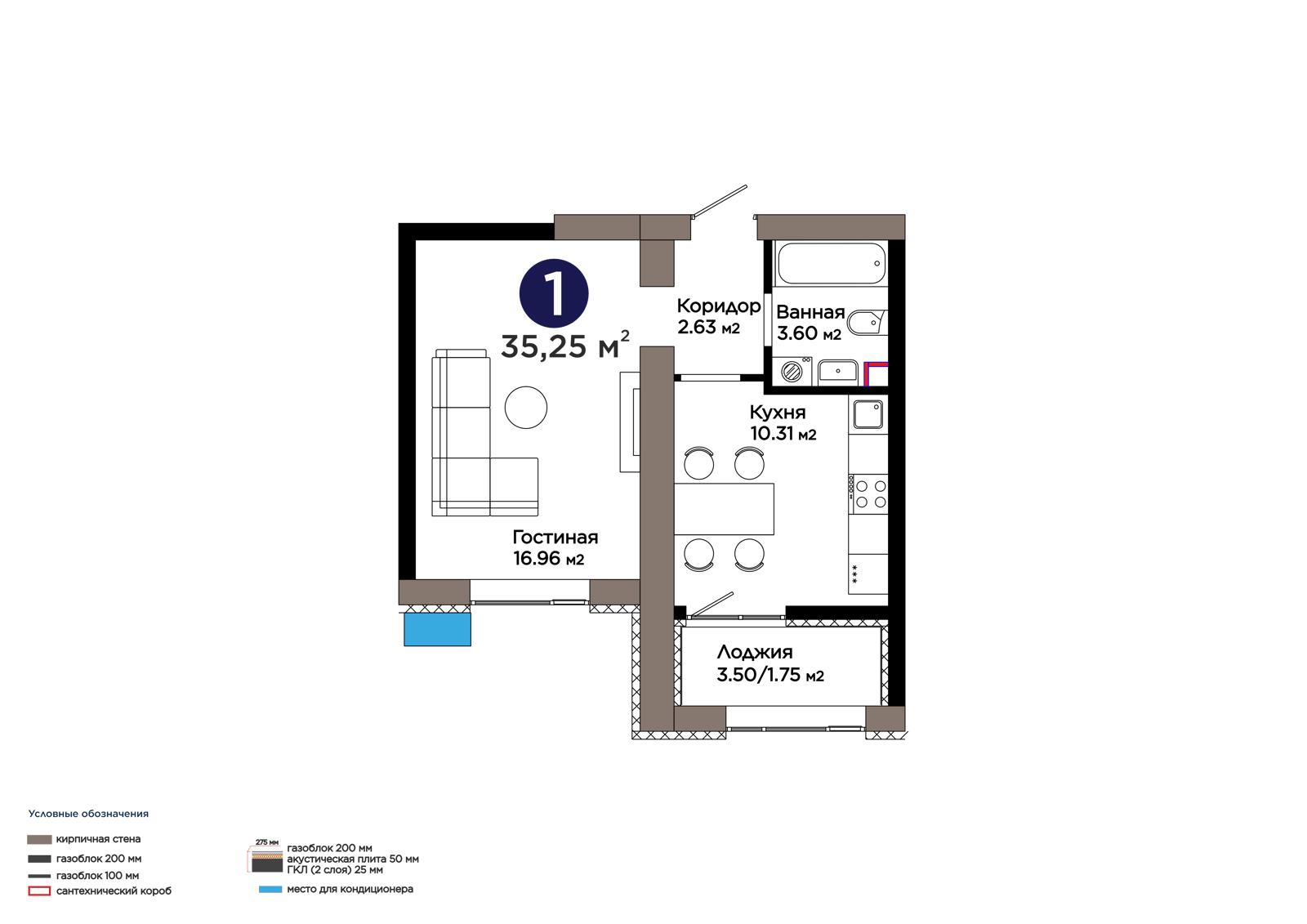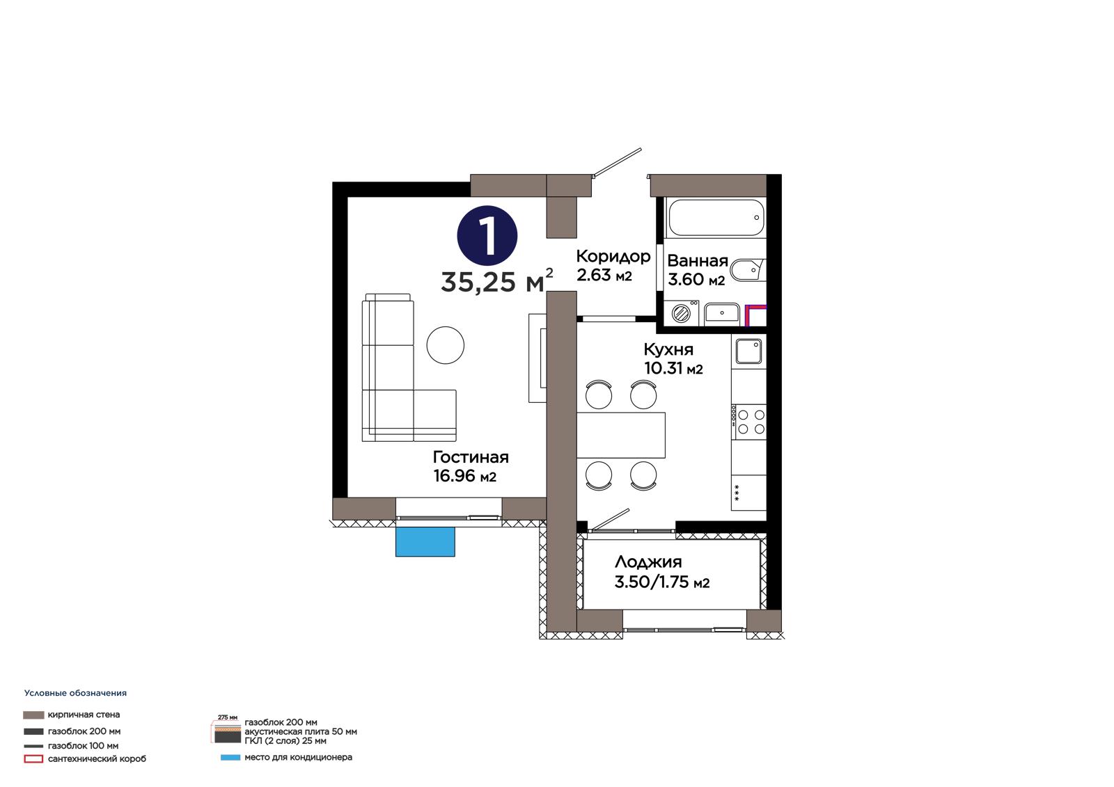 1-комн., 35.25 м², 5 этаж из 9 г. Астана, ЖК Lavita