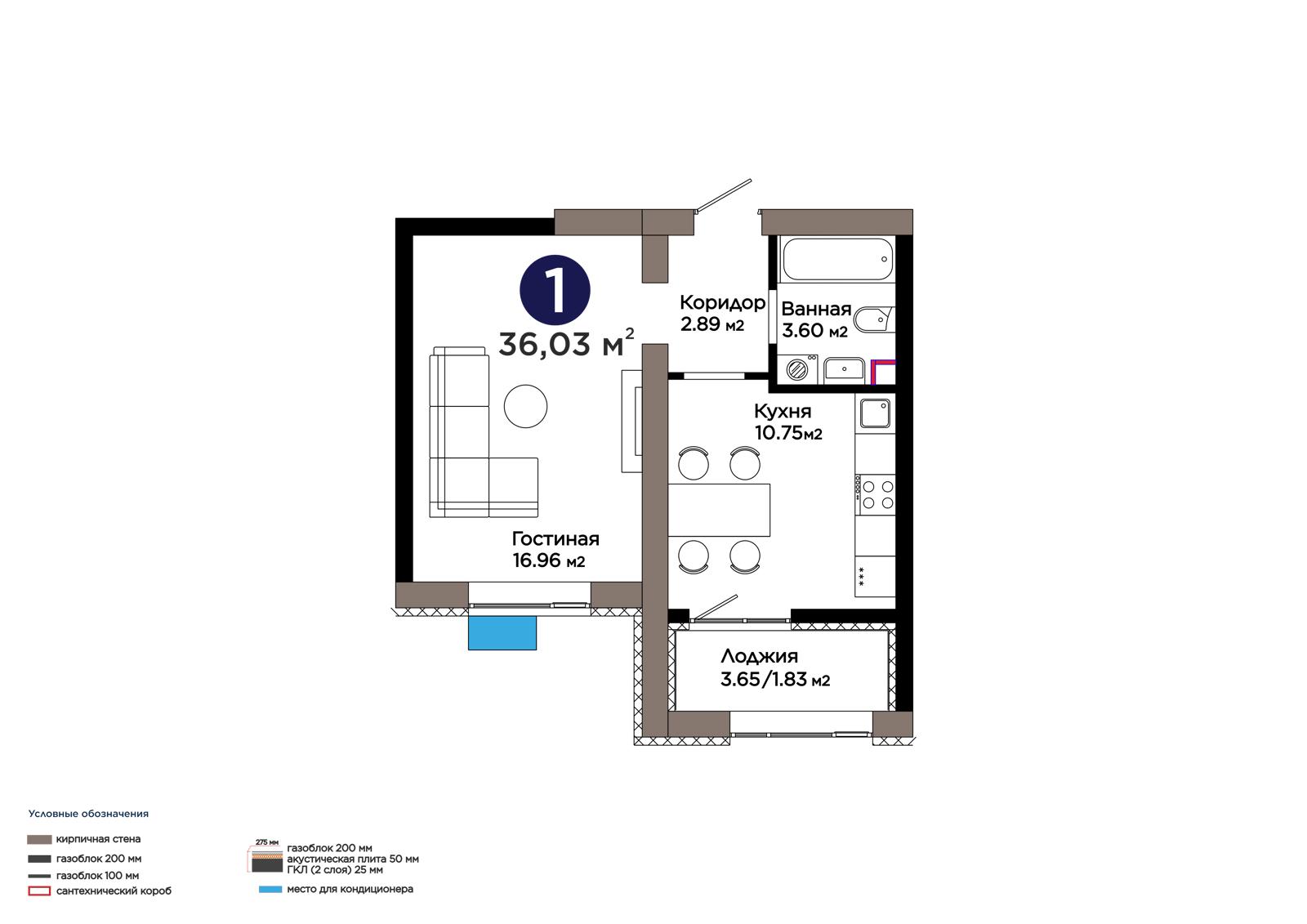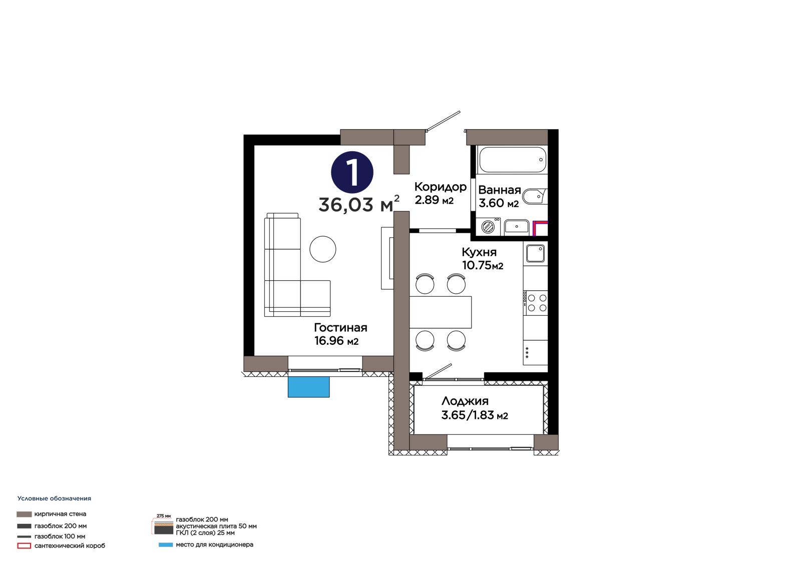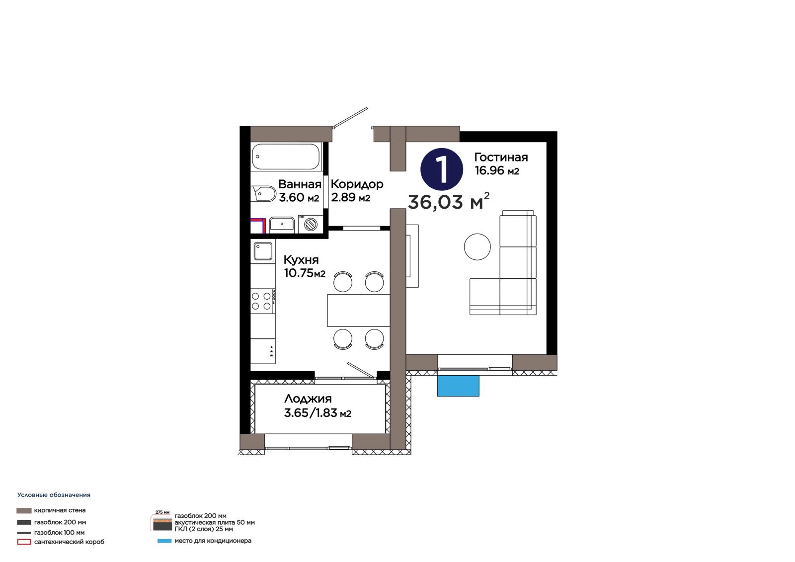 1-комн., 36.03 м², 6 этаж из 9 г. Астана, ЖК Lavita