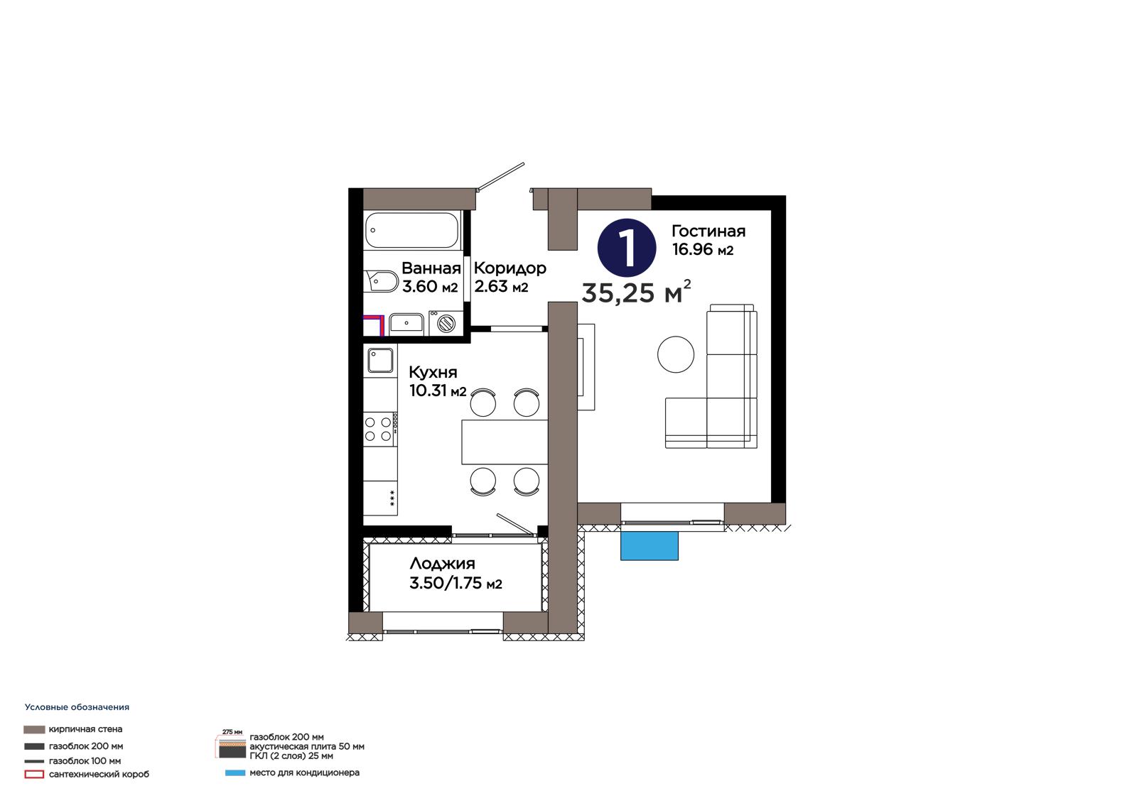 1-комн., 35.25 м², 3 этаж из 9 г. Астана, ЖК Lavita